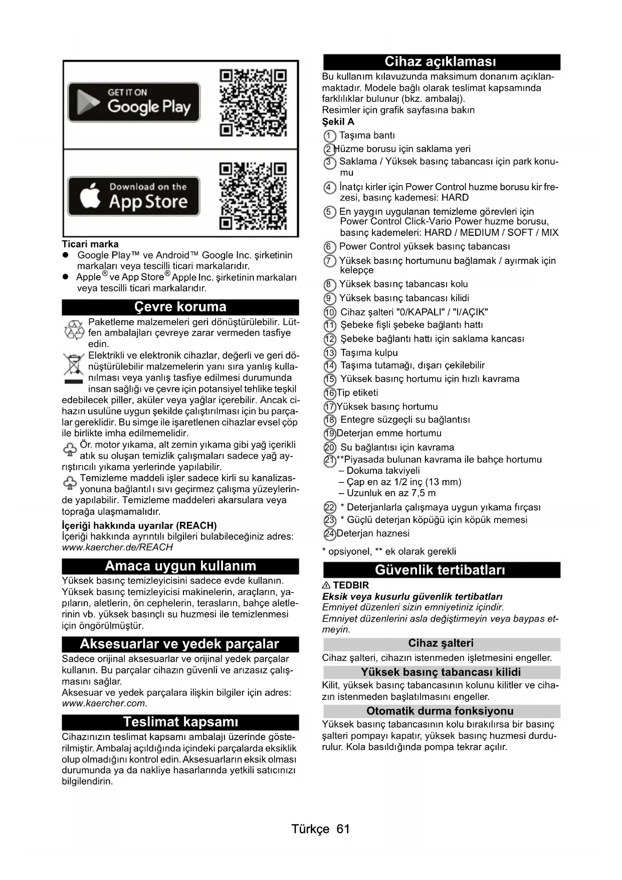 Apple Inc. şirketinin markaları veya tescilli ticari markalarıdır. Çevre koruma Paketleme malzemeleri geri dönüştürülebilir. Lüt- fen ambalajları çevreye zarar vermeden tasfiye edin. Elektrikli ve elektronik cihazlar, değerli ve geri dö- nüştürülebilir malzemelerin yanı sıra yanlış kulla- nılması veya yanlış tasfiye edilmesi durumunda insan sağlığı ve çevre için potansiyel tehlike teşkil edebilecek piller, aküler veya yağlar içerebilir. Ancak ci- hazın usulüne uygun şekilde çalıştırılması için bu parça- lar gereklidir. Bu simge ile işaretlenen cihazlar evsel çöp ile birlikte imha edilmemelidir. Ör. motor yıkama, alt zemin yıkama gibi yağ içerikli atık su oluşan temizlik çalışmaları sadece yağ ay- rıştırıcılı yıkama yerlerinde yapılabilir. Temizleme maddeli işler sadece kirli su kanalizas- yonuna bağlantıl ı sıvı geçirmez çalışma yüzeylerin- de yapılabilir. Temizleme maddeleri akarsulara veya toprağa ulaşmamalıdır. İçeriği hakkında uyarılar (REACH) İçeriği hakkında ayrıntılı bilgileri bulabileceğiniz adres: www.kaercher.de/REACH Amaca uygun kullanım Yüksek basınç temizleyicisini sadece evde kullanın. Yüksek basınç temizleyicisi makinelerin, araçların, ya- pıların, aletlerin, ön cephelerin, terasların, bahçe aletle- rinin vb. yüksek basınçlı su huzmesi ile temizlenmesi için öngörülmüştür. Aksesuarlar ve yedek parçalar Sadece orijinal aksesuarlar ve orijinal yedek parçalar kullanın. Bu parçalar cihazın güvenli ve arızasız çalış- masını sağlar. Aksesuar ve yedek parçalara ilişkin bilgiler için adres: www.kaercher.com. Teslimat kapsamı Cihazınızın teslimat kapsamı ambalajı üzerinde göste- rilmiştir. Ambalaj açıldığında içindeki parçalarda eksiklik olup olmadığını kontrol edin. Aksesuarların eksik olması durumunda ya da nakliye hasarlarında yetkili satıcınızı bilgilendirin. Cihaz açıklaması Bu kullanım kılavuzunda maksimum donanım açıklan- maktadır. Modele bağlı olarak teslimat kapsamında farklılıklar bulunur (bkz. ambalaj). Resimler için grafik sayfasına bakın Şekil A 1 Taşıma bantı 2 Hüzme borusu için saklama yeri 3 Saklama / Yüksek basınç tabancası için park konu-