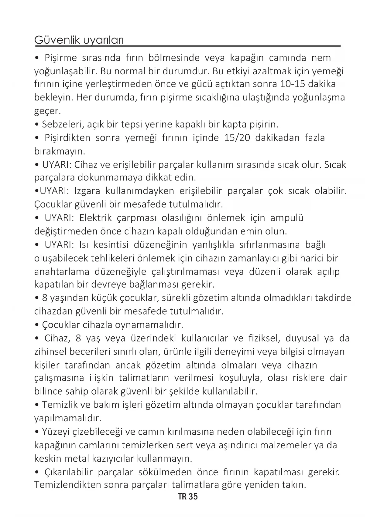 - Çıkarılabilir parçalar sökülmeden önce fırının kapatılması gerekir. Temizlendikten sonra parçaları talimatlara göre yeniden takın.TR 36