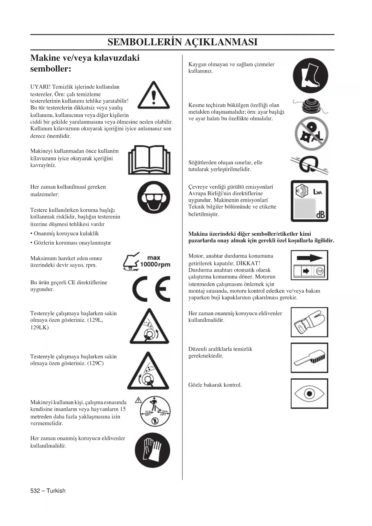 1 Kesme bafllı¤ı 2 Cihaza ya¤ doldurma, debriyajler 3 Debriyajlar 4 Kesme cihazlarının korunması 5 Teçhizat borusu 6 Ba¤lantı borusu 7 Tutamak 8 Gaz ayarí 9 Stop dü¤mesi 10 Kelebek kilidi 11 Buji kapa¤ı ve buji 12 Çalífltírma arací 13 Çalífltírma tutaca¤í 14 Yakít deposu 15 Hava filtresi kapa¤ı 16 Yakıt pompası 17 fiok ayar kolu 18 Yardımcı araçlar 19 Kullanım kılavuzu 20 Anahtar 21 Kilit çubu¤uGENEL GÜVENLIK AÇIKLAMALARI 536 – Turkish Önemli Kiflisel koruyucu araçlar M‹⁄FER Testere kullanılırken koruma bafllı¤ı kullanmak risklidir, bafllı¤ın testerenin üzerine düflmesi tehlikesi vardır GÜRÜLTÜYE KARfiI KORUMA C‹HAZI Gürültüye karflı koruma cihazı, yeterli bir susturucu etkisi sa¤lıyorsa kullanılmalıdır. GÖZ KORUMA C‹HAZI (GÖZLÜK) Daima onaylanmı fl bulunan göz koruma cihazları kullanı lmalı dı r. Mi¤ferin ön parçası nda kullanı lan koruma gözlü¤ü de mutlaka onaylanmı fl olmalı dı r. Koruma gözlü¤ünün onaylanmı fl olması demek, ABD'nin ANSI Z 87.1. standartları na veya AB ülkelerinin EN 166 standartları için aranan flartlara uygun olması anlamı na gelir. ÖNEML‹! Bu makine sadece çimleri kırpmak ve çimlerde alan açmak iin tasarlanmıfltır. Kesme cihazları için motor parçası olarak kullanabilece¤iniz araç-gereçlerin kaynaklarını size tavsiyede bulundu¤umuz Teknik veri bölümünde bulabilirsiniz. Yorgun ya da içkili iken ya da görüfl, karar verme ve bedensel denetim yeteneklerinizi etkileyebilecek olan bir ilaç almíflsaníz makineyi asla kullanmayíníz. Kiflisel koruyucu araçlar kullaníníz. Kiflisel koruyucu araçlar bölümüne bakíníz. Artík orijinal imalatína benzerli¤i kalmayacak biçimde yapísal de¤iflikli¤e u¤ratílmífl bir makineyi asla kullanmayíníz. Hiçbir zaman arızalı bir makineyi kullanmayın. Bu kılavuzda belirtilen güvenlik kontrolleri ile bakım ve servis talimatlarına uyun. Bazı bakım ve servis ifllerinin sadece yetkili ve kalifiye teknisyenler tarafından yapılması gerekir. Bakım bafllı¤ı altındaki talimatlara bakın. Çalıfltırmadan önce tüm kapaklar, siperler ve tutamaklar takılmalıdır. Elektrik çarpması riskini engellemek için buji kapa¤ının ve ateflleme kablosunun hasarsız oldu¤undan emin olun. Makineyi kullanan kifli, çalıflma esnasında kendisine insanların veya hayvanların 15 metreden daha fazla yaklaflmasına izin vermemelidir. Kullanmadan önce makineyi genel olarak kontrol edin ve bakım çizelgesini inceleyin.