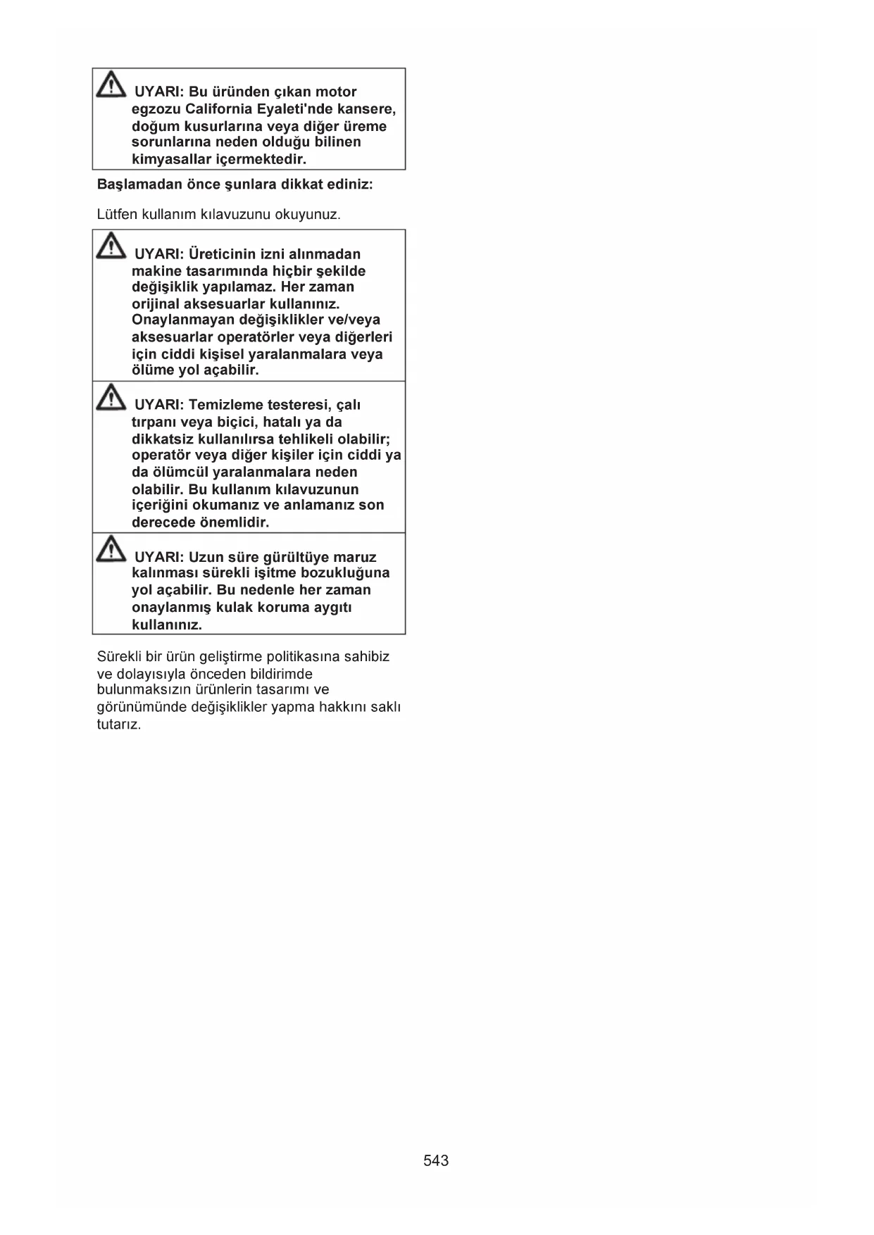 UYARI: Temizleme testeresi, çalı tırpanları ve biçiciler tehlikeli olabilir. Dikkatsiz veya hatalı kullanım operatörde veya diğerlerinde ciddi veya ölümcül yaralanmalara neden olabilir. Lütfen kullanım kılavuzunu dikkatle okuyunuz ve makineyi kullanmadan önce talimatları anladığınızdan emin olunuz. Her zaman kaymaz tabanlı; üzerinize tam oturan giysiler; ağır, uzun pantolonlar ve uzun kollu giysiler; ağır hizmete uygun, kaymaz eldivenler; buğu yapmayan, havalandırmalı gözlükler ya da yüz kalkanı gibi koruyucu gözlükler; güvenli olduğu onaylanmış, sert malzemeden kasklar ve kulaklarınızı korumak için ses bariyerleri (kulak tıpaları ya da susturucular) kullanınız. Uzun saçlı olan kişiler (kişisel güvenlik açısından) saçlarını yukarıdan toplamalıdır. Makinenin operatörü, çalışma sırasında kişilerin veya hayvanların kendisine 15 metreden fazla yaklaşmasına izin vermemelidir.