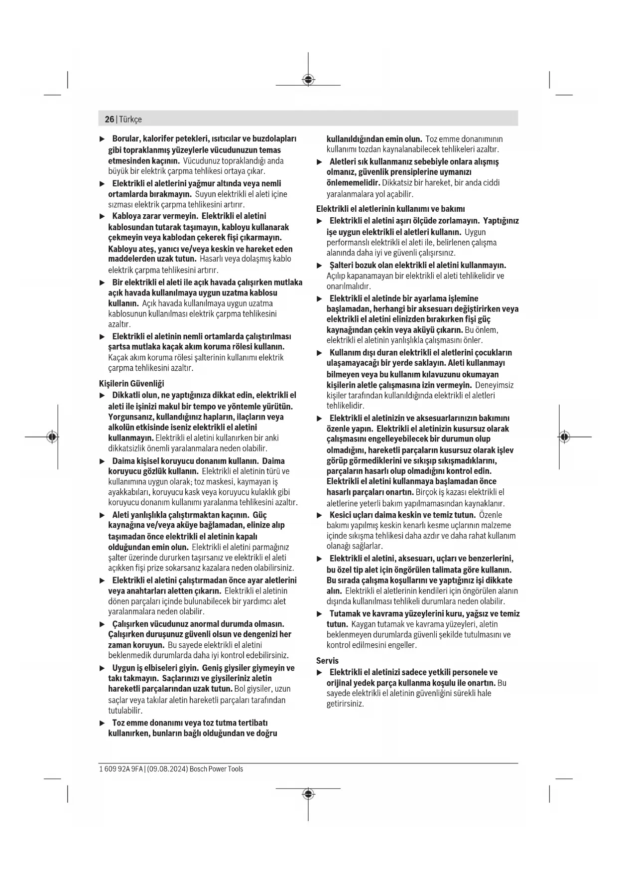 Bu talimatta belirtilen titreşim seviyesi ve gürültü emisyon değeri standartlaştırılmış ölçme yöntemine göre belirlenmiştir ve elektrikli el aletlerinin birbirleri ile kıyaslanmasında kullanılabilir. Bu değerler aynı zamanda titreşim ve gürültü emisyonunun geçici olarak tahmin edilmesine de uygundur. Belirtilen titreşim seviyesi ve gürültü emisyon değeri elektrikli el aletinin esas kullanımını temsil etmektedir. Ancak elektrikli el aleti farkı uçlar veya yetersiz bakımla kullanılacak olursa, titreşim seviyesi ve gürültü emisyonu farklılık gösterebilir. Bu da titreşim ve gürültü emisyonunu bütün kullanım süresince önemli ölçüde artırabilir. Titreşim ve gürültü emisyonunun tam olarak tahmin edilebilmesi için, aletin kapalı olduğu veya açık fakat kullanımda olmadığı sürelerin de dikkate alınması gerekir. Bu, titreşim ve gürültü emisyonunu bütün çalışma süresinde önemli ölçüde düşürebilir. Titreşimin kullanıcıya bindirdiği yük için önceden ek güvenlik önlemleri alın. Örneğin: Elektrikli el aletinin ve uçların bakımı, ellerin sıcak tutulması, iş aşamalarının organize edilmesi. Montaj u Sadece müsaade edilen maksimum hızları elektrikli el aletinin boştaki devir sayısından yüksek olan testere bıçaklarını kullanın. Daire testere bıçağının takılması/değiştirilmesi u Elektrikli el aletinin kendinde bir çalışma yapmadan önce her defasında fişi prizden çekin. u Testere bıçağını takarken koruyucu iş eldivenleri kullanın. Testere bıçağına temas ederseniz yaralanabilirsiniz. u Taşlama disklerini hiçbir zaman uç olarak kullanmayın. u Sadece bu kullanma kılavuzunda ve elektrikli el aletinin üzerinde belirtilen tanıtım verilerine uygun testere bıçakları kullanın . Testere bıçağı seçimi Tavsiye edilen testere bıçaklarına ait genel görünüşü bu kullanma kılavuzunun sonunda bulabilirsiniz. Testere bıçağının sökülmesi (Bakınız: Resim A) Uç değiştirmek için elektrikli el aletini motor gövdesi ön tarafı üzerine yerleştirin. Bosch Power Tools 1 609 92A 9FA | (09.08.2024)30 | Türkçe – Mil kilitleme tuşuna (5) basın ve tuşu basılı tutun. u Mil kilitleme tuşuna (5) sadece testere mili dururken basın. Aksi takdirde elektrikli el aleti hasar görebilir. – İç altıgen anahtarla (17) sıkma vidasını (18) ➊ yönünde çevirerek çıkarın. – Pandül hareketli koruyucu kapağı (12) arkaya getirin ve bu konumda tutun. – Sıkma flanşını (19) ve testere bıçağını (20) testere milinden (22) çıkarın. Testere bıçağının takılması (Bakınız: Resim A) Uç değiştirmek için elektrikli el aletini motor gövdesi ön tarafı üzerine yerleştirin. – Testere bıçağını (20) takılacak bütün sıkma parçalarını temizleyin. – Pandül hareketli koruyucu kapağı (12) geri getirin ve bu konumda tutun. – Testere bıçağını (20) bağlama flanşına (21) yerleştirin. Dişlerin kesme yönü (testere bıçağı üzerindeki ok yönü) ve koruyucu kapak (1) üzerindeki dönme yönü oku birbiri ile uyumlu olmalıdır. – Sıkma flanşını (19) yerine yerleştirin ve sıkma vidasını (18) ➋ yönünde çevirerek takın. Bağlama flanşı (21) ile sıkma flanşının (19) doğru konumda takılmasına dikkat edin. – Mil kilitleme tuşuna (5) basın ve tuşu basılı tutun. – İç altıgen anahtarla (17) sıkma vidasını (18) ➋ yönünde çevirerek sıkın. Sıkma torku 10–12 Nm olmalıdır, bu elle sıkma ek olarak ¼ çevirme demektir. Toz ve talaş emme Kurşun içeren boyalar, bazı ahşap türleri, mineraller ve metaller gibi maddeler işlenirken ortaya çıkan toz sağlığa zararlı olabilir. Bu tozlara temas etmek veya bu tozları solumak alerjik reaksiyonlara ve/veya kullanıcının veya onun yakınındaki kişilerin nefes alma yollarındaki hastalıklara neden olabilir. Kayın veya meşe gibi bazı ağaç tozları kanserojen etkiye sahiptir, özellikle de ahşap işleme sanayiinde kullanılan katkı maddeleri (kromat, ahşap koruyucu maddeler) ile birlikte. Asbest içeren malzemeler sadece uzmanlar tarafından işlenmelidir. – Mümkün olduğu kadar işlediğiniz malzemeye uygun bir toz emme tertibatı kullanın. – Çalışma yerinizi iyi bir biçimde havalandırın. – P2 filtre sınıfı filtre takılı soluk alma maskesi kullanmanızı tavsiye ederiz. İşlenen malzemelere ait ülkenizdeki geçerli yönetmelik hükümlerine uyun. u Çalıştığınız yerde toz birikmemesine dikkat edin. Tozlar kolayca alevlenebilir. Emme adaptörünün takılması (Bakınız: Resim B) Emme adaptörünü (24) talaş atma yerine (16) kilitleme yapıncaya kadar takın. Emme adaptörünü (24) ek olarak vida (23) ile emniyete alın. Emme adaptörüne (24) 35 mm çapında bir emme hortumu takılabilir. u Emme adaptörü harici toz emme donanımı bağlanmadan takılmamalıdır. Aksi takdirde emme kanalı tıkanabilir. u Emme adaptörüne toz torbası takılamaz. Aksi takdirde emme sistemi tıkanabilir. Optimum emme performansı sağlayabilmek için emme adaptörü (24) düzenli aralıklarla temizlenmelidir. Harici toz emme Elektrikli el aletini direkt olarak uzaktan kumandalı bir Bosch çok amaçlı elektrikli süpürgenin prizine takılabilir. Bu elektrikli süpürge, elektrikli el aleti açılınca otomatik olarak çalışmaya başlar. Elektrik süpürgesi işlenen malzemeye uygun olmalıdır. Özellikle sağlığa zararlı, kanserojen veya kuru tozları vakumlarken özel elektrik süpürgesi (sanayi tipi elektrik süpürgesi) kullanın. Almanya'da ahşap tozları için TRGS 553 nedeniyle test edilmiş emme donanımları istenmektedir, alete entegre toz emme donanımları profesyonel sektörde kullanılmamaktadır. Diğer malzemeler için profesyonel kullanıcılar karşılanması gerekli hususları yetkili meslek kuruluşları ile açıklığa kavuşturmak zorundadır. İşletim u Elek