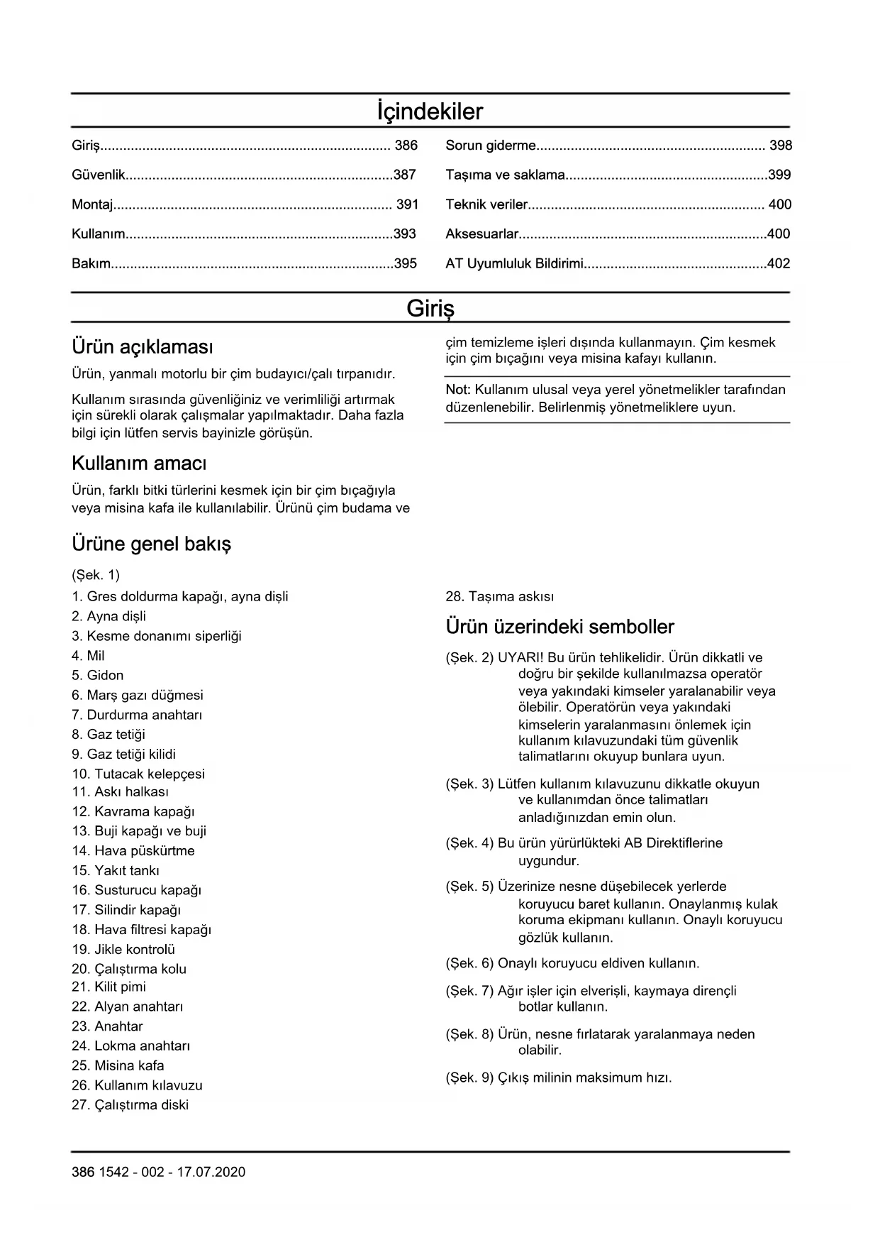 Ürün üzerindeki semboller (Şek. 2) UYARI! Bu ürün tehlikelidir. Ürün dikkatli ve doğru bir şekilde kullanılmazsa operatör veya yakındaki kimseler yaralanabilir veya ölebilir. Operatörün veya yakındaki kimselerin yaralanmasını önlemek için kullanım kılavuzundaki tüm güvenlik talimatlarını okuyup bunlara uyun. (Şek. 3) Lütfen kullanım kılavuzunu dikkatle okuyun ve kullanımdan önce talimatları anladığınızdan emin olun. (Şek. 4) Bu ürün yürürlükteki AB Direktiflerine uygundur. (Şek. 5) Üzerinize nesne düşebilecek yerlerde koruyucu baret kullanın. Onaylanmış kulak koruma ekipmanı kullanın. Onaylı koruyucu gözlük kullanın. (Şek. 6) Onaylı koruyucu eldiven kullanın. (Şek. 7) Ağır işler için elverişli, kaymaya dirençli botlar kullanın. (Şek. 8) Ürün, nesne fırlatarak yaralanmaya neden olabilir. (Şek. 9) Çıkış milinin maksimum hızı. 386 1542 - 002 - 17.07.2020(Şek. 10) Ürünü kullanırken başka kişilerle ve hayvanlarla aranızda en az 15 m (50 ft) mesafe bırakın. (Şek. 11) Kesme donanımı anında kesemediği bir nesneye dokunursa bıçak saplanması riski oluşur. Ürün, uzuvların kesilmesine neden olabilir. Ürünü kullanırken başka kişilerle ve hayvanlarla aranızda en az 15 m (50 ft) mesafe bırakın. (Şek. 12) Yakıt pompası diyaframı haznesi. (Şek. 13) Jikleyi kapatma yönü. (Şek. 14) Jikleyi açma yönü. (Şek. 15) Avrupa Direktifi 2000/14/AT ve Yeni Güney Galler mevzuatı "Çevre Koruma Operasyonları (Gürültü kontrolü) Yönetmeliği 2017" uyarınca çevreye yayılan gürültü emisyonları. Gürültü emisyonu verileri makine etiketinde ve Teknik veriler bölümünde bulunabilir. yyyyhhxxxx