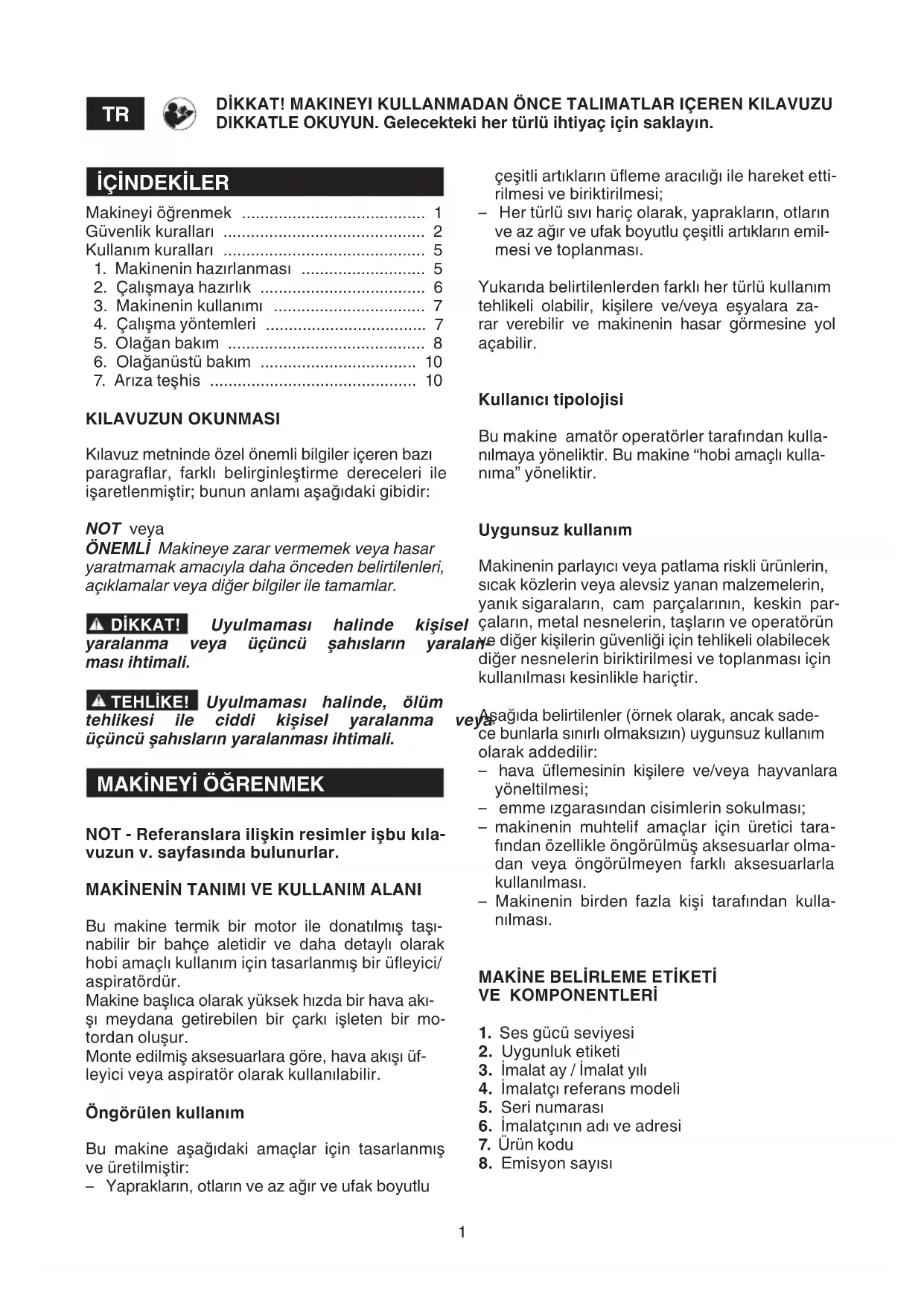 NOT - Referanslara ilişkin resimler işbu kıla- vuzun v. sayfasında bulunurlar. MAKİNENİN TANIMI VE KULLANIM ALANI Bu makine termik bir motor ile donatılmış taşı- nabilir bir bahçe aletidir ve daha detaylı olarak hobi amaçlı kullanım için tasarlanmış bir üeyici/ aspiratördür. Makine başlıca olarak yüksek hızda bir hava akı- şı meydana getirebilen bir çarkı işleten bir mo- tordan oluşur. Monte edilmiş aksesuarlara göre, hava akışı üf- leyici veya aspiratör olarak kullanılabilir. Öngörülen kullanım Bu makine aşağıdaki amaçlar için tasarlanmış ve üretilmiştir: – Yaprakların, otların ve az ağır ve ufak boyutlu çeşitli artıkların üeme aracılığı ile hareket etti- rilmesi ve biriktirilmesi; – Her türlü sıvı hariç olarak, yaprakların, otların ve az ağır ve ufak boyutlu çeşitli artıkların emil- mesi ve toplanması. Yukarıda belirtilenlerden farklı her türlü kullanım tehlikeli olabilir, kişilere ve/veya eşyalara za- rar verebilir ve makinenin hasar görmesine yol açabilir. Kullanıcı tipolojisi Bu makine amatör operatörler tarafından kulla- nılmaya yöneliktir. Bu makine “hobi amaçlı kulla- nıma” yöneliktir. Uygunsuz kullanım Makinenin parlayıcı veya patlama riskli ürünlerin, sıcak közlerin veya alevsiz yanan malzemelerin, yanık sigaraların, cam parçalarının, keskin par- çaların, metal nesnelerin, taşların ve operatörün ve diğer kişilerin güvenliği için tehlikeli olabilecek diğer nesnelerin biriktirilmesi ve toplanması için kullanılması kesinlikle hariçtir. Aşağıda belirtilenler (örnek olarak, ancak sade- ce bunlarla sınırlı olmaksızın) uygunsuz kullanım olarak addedilir: – hava üemesinin kişilere ve/veya hayvanlara yöneltilmesi; – emme ızgarasından cisimlerin sokulması; – makinenin muhtelif amaçlar için üretici tara- fından özellikle öngörülmüş aksesuarlar olma- dan veya öngörülmeyen farklı aksesuarlarla kullanılması. – Makinenin birden fazla kişi tarafından kulla- nılması.