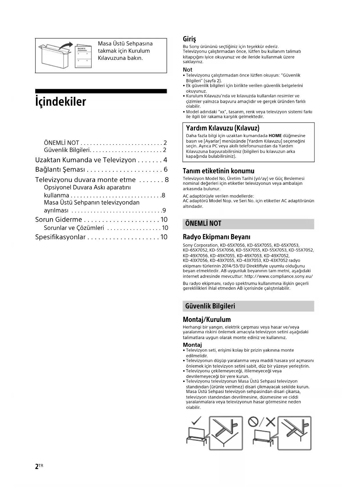 - Televizyonu çalıştırmadan önce lütfen okuyun: “Güvenlik Bilgileri” (sayfa 2).• Ek güvenlik bilgileri için birlikte verilen güvenlik belgelerini okuyunuz.• Kurulum Kılavuzu’nda ve kılavuzda kullanılan resimler ve çizimler yalnızca başvuru amaçlıdır ve gerçek üründen farklı olabilir.• Model adındaki “xx”, tasarım, renk veya televizyon sistemi farkı ile ilgili bir rakama karşılık gelmektedir. Tanım etiketinin konumu Televizyon Model No, Üretim Tarihi (yıl/ay) ve Güç Beslemesi nominal değerleri için etiketler televizyonun veya ambalajın arkasında bulunur.AC adaptörüyle verilen modellerde:AC adaptörü Model Nop. ve Seri No. için etiketler AC adaptörünün altındadır. ÖNEMLİ NOT Radyo Ekipmanı Beyanı Sony Corporation, KD-65X7056, KD-65X7055, KD-65X7053, KD-65X7052, KD-55X7056, KD-55X7055, KD-55X7053, KD-55X7052, KD-49X7056, KD-49X7055, KD-49X7053, KD-49X7052, KD-43X7056, KD-43X7055, KD-43X7053, KD-43X7052 radyo ekipmanı türlerinin 2014/53/EU Direktifiyle uyumlu olduğunu beyan etmektedir. AB uygunluk beyanının tam metni, aşağıdaki internet adresinde mevcuttur: http://www.compliance.sony.eu/Bu radyo ekipmanı, radyo spektrumu kullanımına ilişkin geçerli gereklilikleri ihlal etmeden AB içerisinde çalıştırılabilir. Güvenlik Bilgileri Montaj/Kurulum Herhangi bir yangın, elektrik çarpması veya hasar ve/veya yaralanma riskini önlemek amacıyla televizyon setini aşağıdaki talimatlara uygun olarak monte ediniz ve kullanınız. Montaj