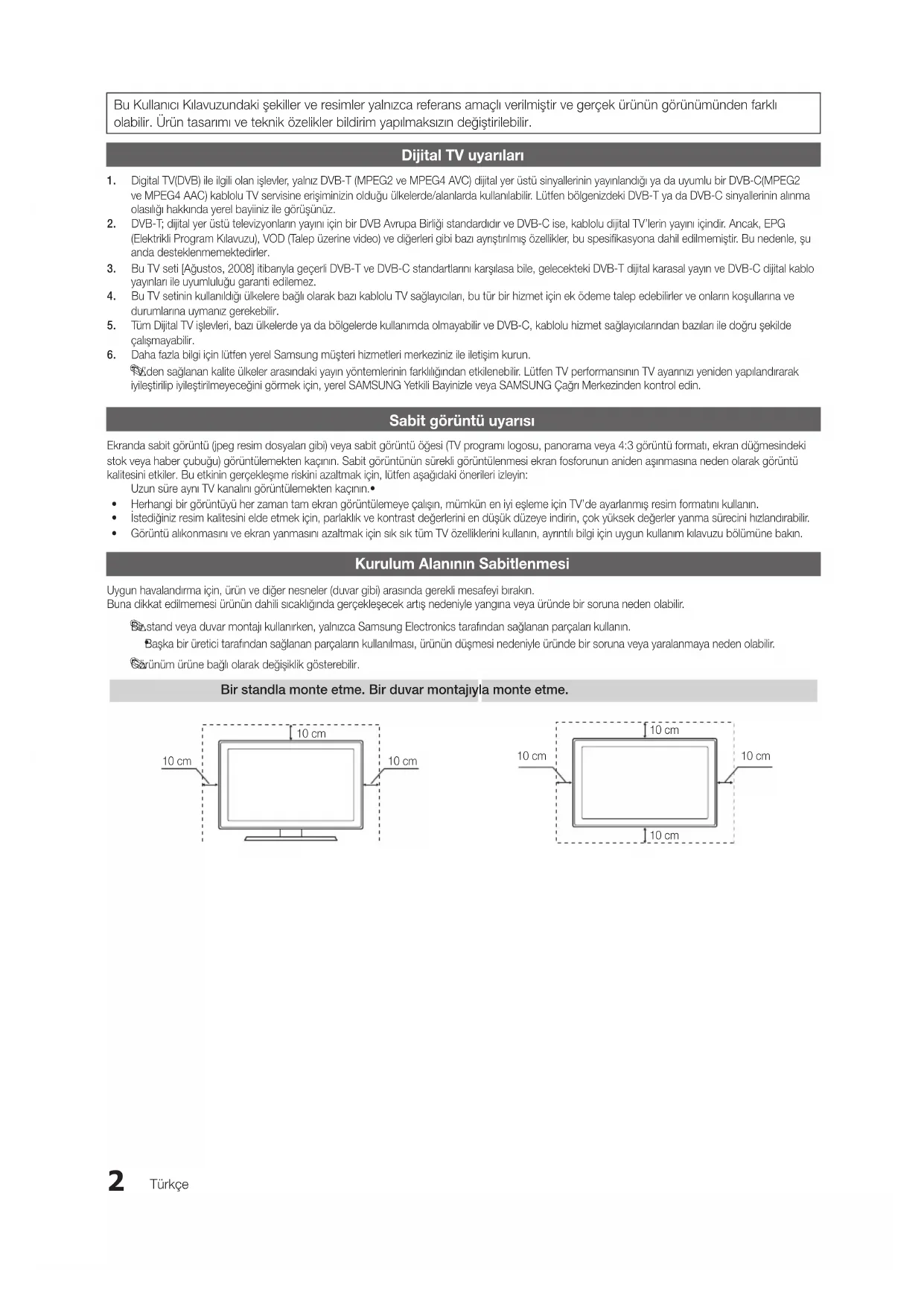 iyileştirilip iyileştirilmeyeceğini görmek için, yerel SAMSUNG Yetkili Bayinizle veya SAMSUNG Çağrı Merkezinden kontrol edin. Sabit görüntü uyarısı Ekranda sabit görüntü (jpeg resim dosyaları gibi) veya sabit görüntü öğesi (TV programı logosu, panorama veya 4:3 görüntü formatı, ekran düğmesindeki stok veya haber çubuğu) görüntülemekten kaçının. Sabit görüntünün sürekli görüntülenmesi ekran fosforunun aniden aşınmasına neden olarak görüntü kalitesini etkiler. Bu etkinin gerçekleşme riskini azaltmak için, lütfen aşağıdaki önerileri izleyin: Uzun süre aynı TV kanalını görüntülemekten kaçının.• Herhangi bir görüntüyü her zaman tam ekran görüntülemeye çalışın, mümkün en iyi eşleme için TV’de ayarlanmış resim formatını kullanın.• İstediğiniz resim kalitesini elde etmek için, parlaklık ve kontrast değerlerini en düşük düzeye indirin, çok yüksek değerler yanma sürecini hızlandırabilir.• Görüntü alıkonmasını ve ekran yanmasını azaltmak için sık sık tüm TV özelliklerini kullanın, ayrıntılı bilgi için uygun kullanım kılavuzu bölümüne bakın.• Kurulum Alanının Sabitlenmesi Uygun havalandırma için, ürün ve diğer nesneler (duvar gibi) arasında gerekli mesafeyi bırakın. Buna dikkat edilmemesi ürünün dahili sıcaklığında gerçekleşecek artış nedeniyle yangına veya üründe bir soruna neden olabilir. Bir stand veya duvar montajı kullanırken, yalnızca Samsung Electronics tarafından sağlanan parçaları kullanın.