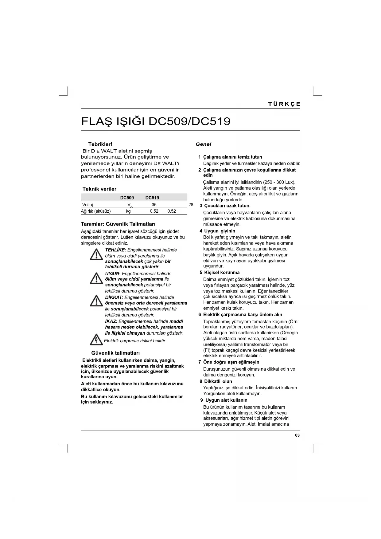 Genel 1 Çalışma alanını temiz tutun Dağınık yerler ve tümsekler kazaya neden olabilir. 2 Çalışma alanınızın çevre koşullarına dikkat edin Çalisma alanini iyi isiklandirin (250 - 300 Lux). Aleti yangın ve patlama olasılığı olan yerlerde kullanmayın, Örneğin, ateş alıcı likit ve gazların bulunduğu yerlerde. 3 Çocukları uzak tutun. Çocukların veya hayvanların çalışılan alana girmesine ve elektrik kablosuna dokunmasına müsaade etmeyin. 4 Uygun giyinin Bol kıyafet giymeyin ve takı takmayın, aletin hareket eden kısımlarına veya hava akımına kaptırabilirsiniz. Saçınız uzunsa koruyucu başlık giyin. Açık havada çalışırken uygun eldiven ve kaymayan ayakkabı giyilmesi uygundur. 5 Kişisel korunma Daima emniyet gözlükleri takın. İşlemin toz veya fırlayan parçacık yaratması halinde, yüz veya toz maskesi kullanın. Eğer tanecikler çok sıcaksa ayrıca ısı geçirmez önlük takın. Her zaman kulak koruyucu takın. Her zaman emniyet kaskı takın. 6 Elektrik çarpmasına karşı önlem alın Topraklanmış yüzeylere temastan kaçının (Örn: borular, radyatörler, ocaklar ve buzdolapları). Aleti olagan üstü sartlarda kullanirken (Örnegin yüksek miktarda nem varsa, maden talasi üretiliyorsa) yalitimli transformatör veya bir (FI) toprak kaçagi devre kesicisi yerlestirilerek elektrik emniyeti arttirilabilinir. 7 Öne doğru aşırı eğilmeyin Duruşunuzun güvenli olmasına dikkat edin ve daima dengenizi koruyun. 8 Dikkatli olun Yaptığınız işe dikkat edin. İnisiyatifinizi kullanın. Yorgunken aleti kullanmayın. 9 Uygun alet kullanın Bu ürünün kullanım tasarımı bu kullanım kılavuzunda anlatılmıştır. Küçük alet veya aksesuarları, ağır hizmet tipi aletin görevini yapmaya zorlamayın. Alet, imalat amacına Tebrikler! Bir D E WALT aletini seçmiş bulunuyorsunuz. Ürün geliştirme ve yenilemede yılların deneyimi D E WALT'ı profesyonel kullanıcılar işin en güvenilir partnerlerden biri haline getirmektedir. Teknik veriler DC509 DC519 Voltaj V