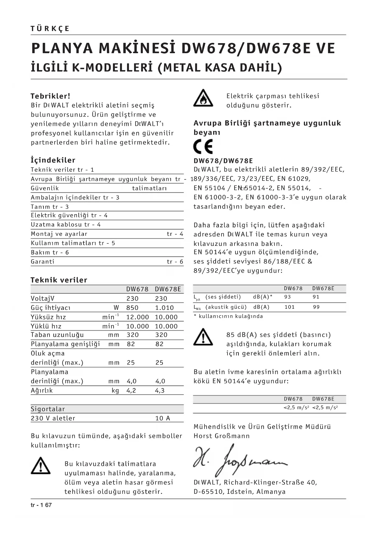 Taban uzunluğu mm 320 320 Planyalama genişliği mm 82 82 Oluk açma derinliği (max.) mm 25 25 Planyalama derinliği (max.) mm 4,0 4,0 Ağrlk kg 4,2 4,3 Sigortalar 230 V aletler 10 A Bu klavuzun tümünde, aşağdaki semboller kullanlmştr: Bu klavuzdaki talimatlara uyulmamas halinde, yaralanma, ölüm veya aletin hasar görmesi tehlikesi olduğunu gösterir. Elektrik çarpmas tehlikesi olduğunu gösterir. Avrupa Birliği şartnameye uygunluk beyan3 DW678/DW678E