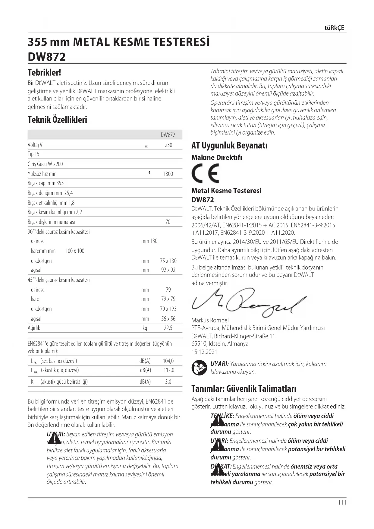 DİKKAT: Engellenmemesi halinde önemsiz veya orta dereceli yaralanma ile sonuçlanabilecek potansiyel bir tehlikeli durumugösterir. AT Uygunluk Beyanatı Makıne Dırektıfı Metal Kesme Testeresi DW872 DeWALT, Teknik Özellikleri bölümünde açıklanan bu ürünlerin aşağıda belirtilen yönergelere uygun olduğunu beyan eder: 2006/42/AT, EN62841-1:2015 + AC:2015, EN62841-3-9:2015 +A11:2017, EN62841-3-9:2020 + A11:2020.Bu ürünler ayrıca 2014/30/EU ve 2011/65/EU Direktiflerine de uygundur. Daha ayrıntılı bilgi için, lütfen aşağıdaki adresten DeWALT ile temas kurun veya kılavuzun arka kapağınabakın.Bu belge altında imzası bulunan yetkili, teknik dosyanın derlenmesinden sorumludur ve bu beyanı DeWALT adınavermiştir.Markus Rompel PTE-Avrupa, Mühendislik Birimi Genel Müdür Yardımcısı DeWALT, Richard-Klinger-Straße 11, 65510, Idstein, Almanya 15.12.2021Bu bilgi formunda verilen titreşim emisyon düzeyi, EN62841’de belirtilen bir standart teste uygun olarak ölçülmüştür ve aletleri birbiriyle karşılaştırmak için kullanılabilir. Maruz kalmaya dönük bir ön değerlendirme olarakkullanılabilir. UYARI: Beyan edilen titreşim ve/veya gürültü emisyon seviyesi, aletin temel uygulamalarını yansıtır. Bununla birlikte alet farklı uygulamalar için, farklı aksesuarla veya yeterince bakım yapılmadan kullanıldığında, titreşim ve/veya gürültü emisyonu değişebilir. Bu, toplam çalışma süresindeki maruz kalma seviyesini önemli ölçüdeartırabilir.DW872Voltaj V