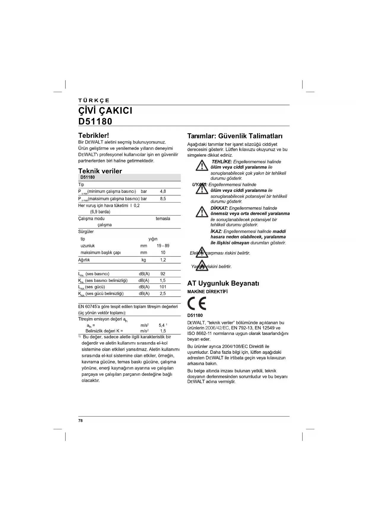 ÇİVİ ÇAKICI D51180 Tanımlar: Güvenlik Talimatları Aşağıdaki tanımlar her işaret sözcüğü ciddiyet derecesini gösterir. Lütfen kılavuzu okuyunuz ve bu simgelere dikkat ediniz. TEHLİKE: Engellenmemesi halinde ölüm veya ciddi yaralanma ile sonuçlanabilecek çok yakın bir tehlikeli durumu gösterir. UYARI: Engellenmemesi halinde ölüm veya ciddi yaralanma ile sonuçlanabilecek potansiyel bir tehlikeli durumu gösterir. DİKKAT: Engellenmemesi halinde önemsiz veya orta dereceli yaralanma ile sonuçlanabilecek potansiyel bir tehlikeli durumu gösterir. İKAZ: Engellenmemesi halinde maddi hasara neden olabilecek, yaralanma ile ilişkisi olmayan durumları gösterir. Elektrik çarpması riskini belirtir. Yangın riskini belirtir. AT Uygunluk Beyanatı