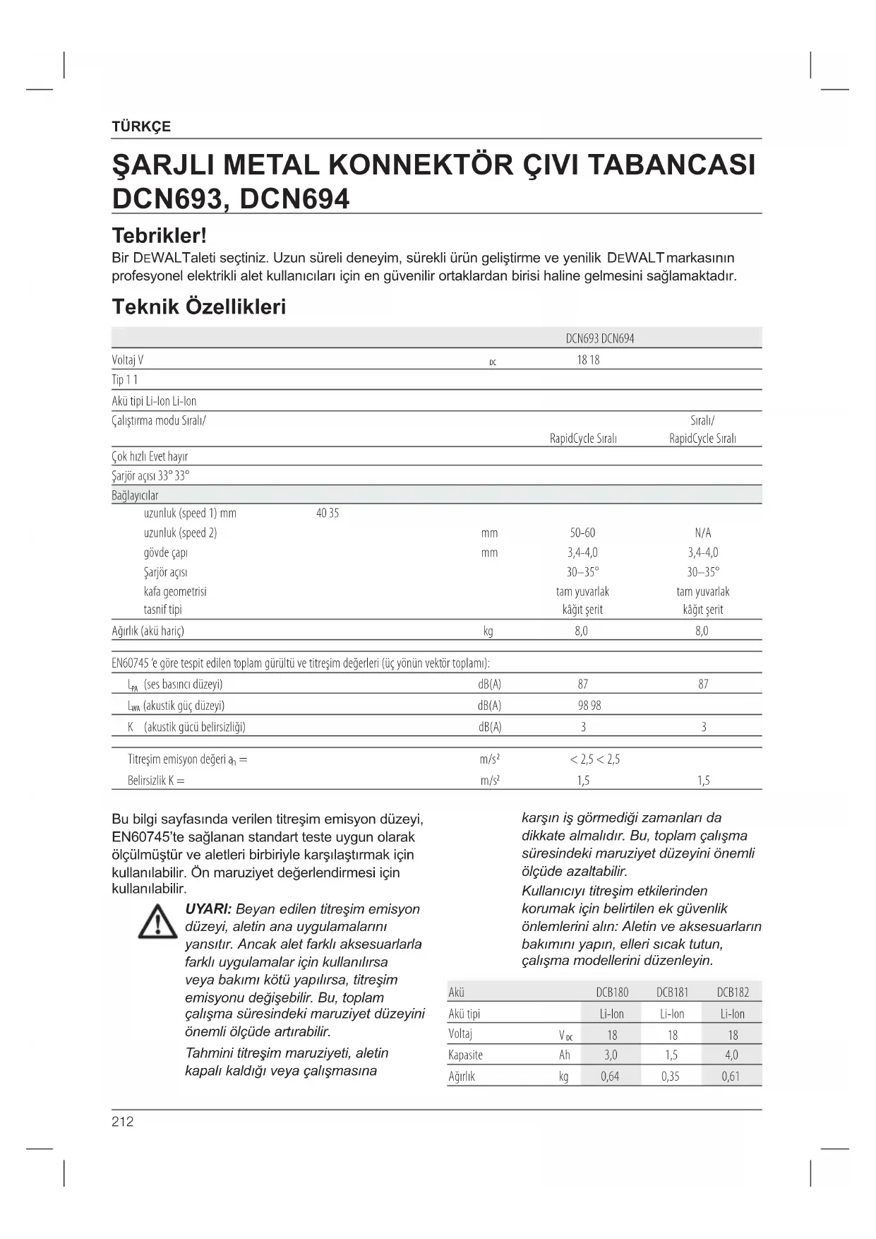 DCN693, DCN694 Tebrikler! Türkçe (orijinal talimatlardan çevrilmiştir) Bu bilgi sayfasında verilen titreşim emisyon düzeyi, EN60745’te sağlanan standart teste uygun olarak ölçülmüştür ve aletleri birbiriyle karşılaştırmak için kullanılabilir. Ön maruziyet değerlendirmesi için kullanılabilir. UYARI: Beyan edilen titreşim emisyon düzeyi, aletin ana uygulamalarını yansıtır. Ancak alet farklı aksesuarlarla farklı uygulamalar için kullanılırsa veya bakımı kötü yapılırsa, titreşim emisyonu değişebilir. Bu, toplam çalışma süresindeki maruziyet düzeyini önemli ölçüde artırabilir. Tahmini titreşim maruziyeti, aletin kapalı kaldığı veya çalışmasına karşın iş görmediği zamanları da dikkate almalıdır. Bu, toplam çalışma süresindeki maruziyet düzeyini önemli ölçüde azaltabilir. Kullanıcıyı titreşim etkilerinden korumak için belirtilen ek güvenlik önlemlerini alın: Aletin ve aksesuarların bakımını yapın, elleri sıcak tutun, çalışma modellerini düzenleyin. Akü