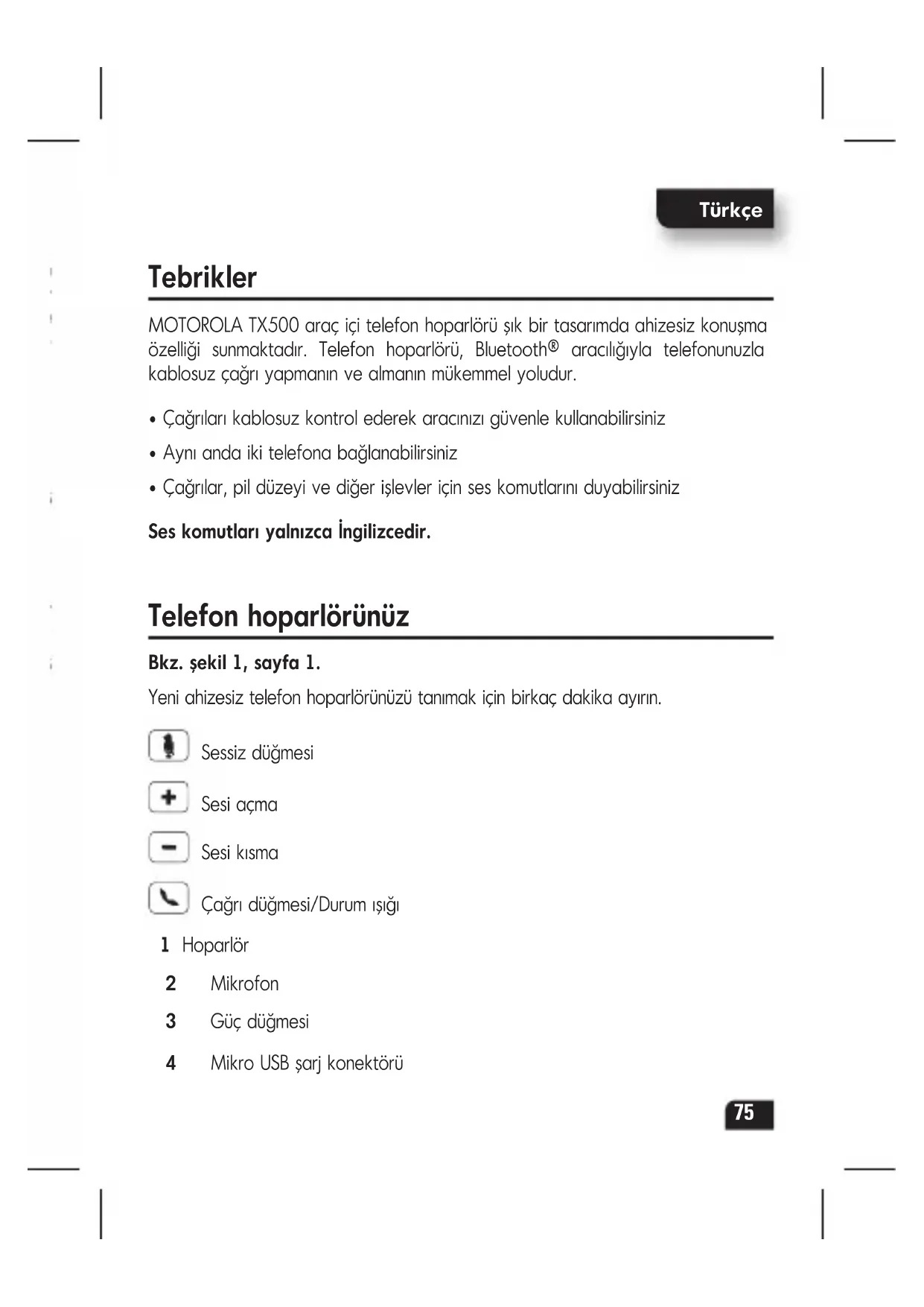 - Çağrılar, pil düzeyi ve diğer işlevler için ses komutlarını duyabilirsiniz Ses komutları yalnızca İngilizcedir. Telefon hoparlörünüz Bkz. şekil 1, sayfa 1. Yeni ahizesiz telefon hoparlörünüzü tanımak için birkaç dakika ayırın. Sessiz düğmesi Sesi açma Sesi kısma Çağrı düğmesi/Durum ışığı 1 Hoparlör 2 Mikrofon 3 Güç düğmesi 4 Mikro USB şarj konektörüTürkçe