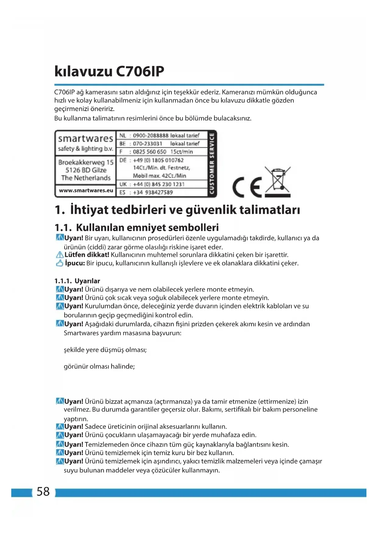 Este dispositivo tiene una garantía limitada de 3 año(s). Consulte las condiciones de la garantía en: www.smartwares.eu.58 kılavuzu C706IP C706IP ağ kamerasını satın aldığınız için teşekkür ederiz. Kameranızı mümkün olduğunca hızlı ve kolay kullanabilmeniz için kullanmadan önce bu kılavuzu dikkatle gözden geçirmenizi öneririz. Bu kullanma talimatının resimlerini önce bu bölümde bulacaksınız. www.smartwares.eu