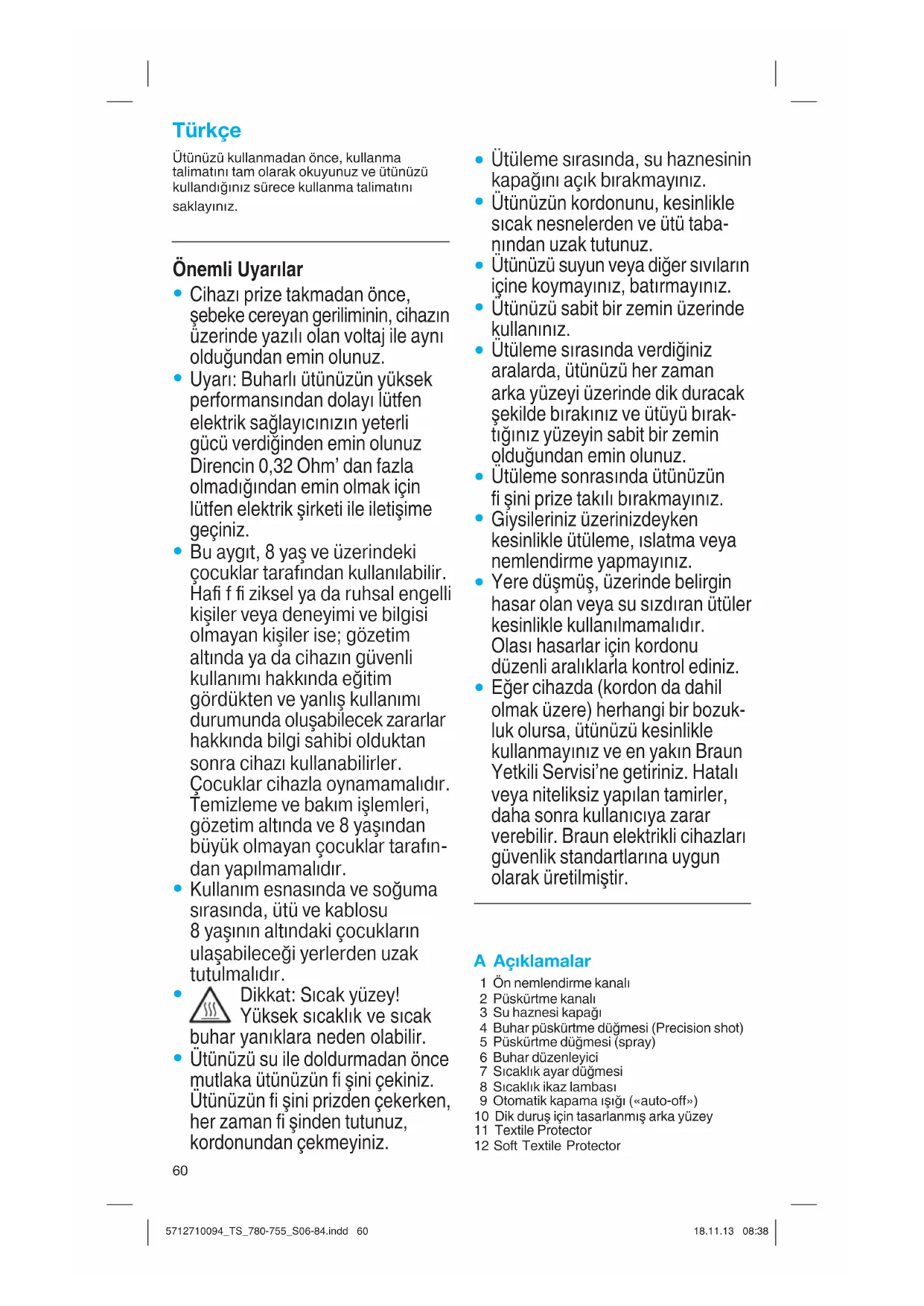 Eπer cihazda (kordon da dahil olmak üzere) herhangi bir bozuk- luk olursa, ütünüzü kesinlikle kullanmayınız ve en yakın Braun Yetkili Servisi’ne getiriniz. Hatalı veya niteliksiz yapılan tamirler, daha sonra kullanıcıya zarar verebilir. Braun elektrikli cihazları güvenlik standartlarına uygun olarak üretilmiμtir. A Açıklamalar 1 Ön nemlendirme kanalı 2 Püskürtme kanalı 3 Su haznesi kapaπı 4 Buhar püskürtme düπmesi (Precision shot) 5 Püskürtme düπmesi (spray) 6 Buhar düzenleyici 7 Sıcaklık ayar düπmesi 8 Sıcaklık ikaz lambası 9 Otomatik kapama ıμıπı («auto-off») 10 Dik duruμ için tasarlanmıμ arka yüzey 11 Textile Protector 12 Soft Textile Protector Türkçe 5712710094_TS_780-755_S06-84.indd 605712710094_TS_780-755_S06-84.indd 60 18.11.13 08:3818.11.13 08:3861 B Baμlamadan önce Bu ürün musluk suyuna uygun olarak tasarlanmıμtır. Eπer musluk suyu aμırı kireçli ise musluk suyunu ve saf suyu (ütü suyu) yarı yarıya karıμtırarak kullanmanızı öneriyoruz. «max» ibaresine gelene kadar su tankını doldurunuz. Musluk suyu ile karıμtırmadan sadece saf su (ütü suyu) kullanmayınız. Herhangi bir katkı maddesi ilave etmeyiniz (örneπin kola). Çamaμ∂r kurutucusundan ç∂kan yo©unlaμm∂μ suyu kullanmay∂n∂z.