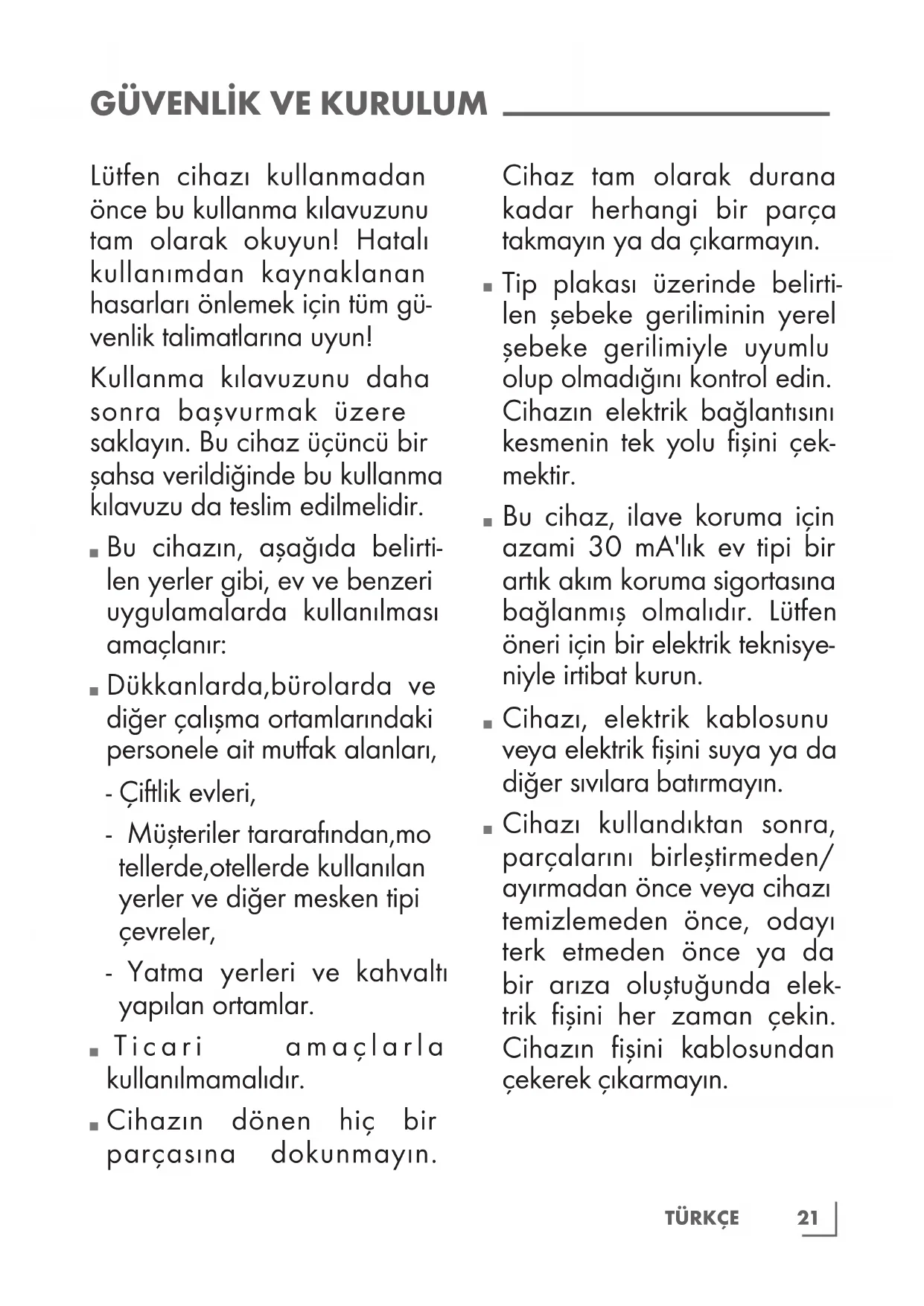 Lütfen cihazı kullanmadan önce bu kullanma kılavuzunu tam olarak okuyun! Hatalı kullanımdan kaynaklanan hasarları önlemek için tüm gü- venlik talimatlarına uyun! Kullanma kılavuzunu daha sonra başvurmak üzere saklayın. Bu cihaz üçüncü bir şahsa verildiğinde bu kullanma kılavuzu da teslim edilmelidir.