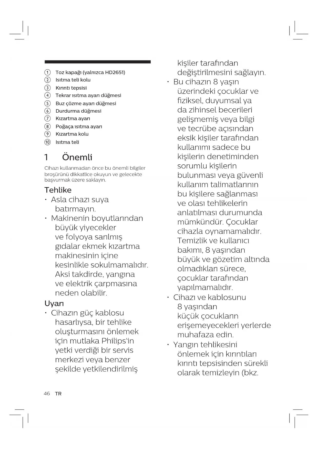 - Yangın tehlikesini önlemek için kırıntıları kırıntı tepsisinden sürekli olarak temizleyin (bkz. a Toz kapağı (yalnızca HD2651) b Isıtma teli kolu c Kırıntı tepsisi d Tekrar ısıtma ayarı düğmesi e Buz çözme ayarı düğmesi f Durdurma düğmesi g Kızartma ayarı h Poğaça ısıtma ayarı i Kızartma kolu j Isıtma teli 1 Önemli Cihazı kullanmadan önce bu önemli bilgiler broşürünü dikkatlice okuyun ve gelecekte başvurmak üzere saklayın. Tehlike