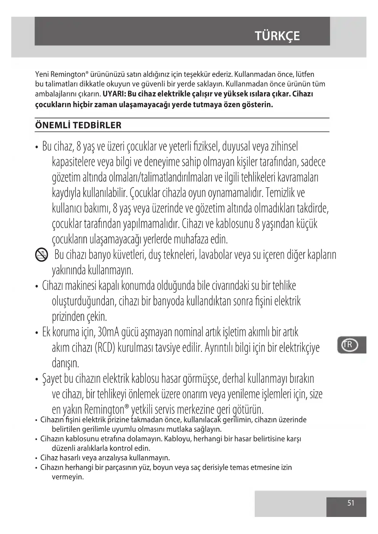 - Şayet bu cihazın elektrik kablosu hasar görmüşse, derhal kullanmayı bırakın ve cihazı, bir tehlikeyi önlemek üzere onarım veya yenileme işlemleri için, size en yakın Remington® yetkili servis merkezine geri götürün.