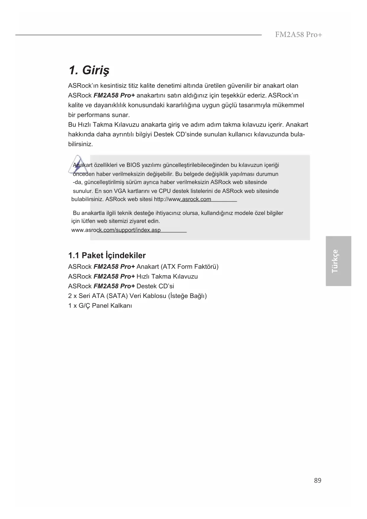 ASRock’ınkesintisiztitizkalitedenetimialtındaüretilengüvenilirbiranakartolan ASRock FM2A58 Pro+anakartınısatınaldığınıziçinteşekkürederiz.ASRock’ın kalitevedayanıklılıkkonusundakikararlılığınauygungüçlütasarımıylamükemmel bir performans sunar. BuHızlıTakmaKılavuzuanakartagirişveadımadımtakmakılavuzuiçerir.Anakart hakkındadahaayrıntılıbilgiyiDestekCD’sindesunulankullanıcıkılavuzundabula- bilirsiniz. AnakartözellikleriveBIOSyazılımıgüncelleştirilebileceğindenbukılavuzuniçeriği öncedenhaberverilmeksizindeğişebilir.Bubelgededeğişiklikyapılmasıdurumun -da,güncelleştirilmişsürümayrıcahaberverilmeksizinASRockwebsitesinde sunulur.EnsonVGAkartlarınıveCPUdesteklistelerinideASRockwebsitesinde bulabilirsiniz. ASRock web sitesi http://www.asrock.com Buanakartlailgiliteknikdesteğeihtiyacınızolursa,kullandığınızmodeleözelbilgiler için lütfen web sitemizi ziyaret edin. www.asrock.com/support/index.asp