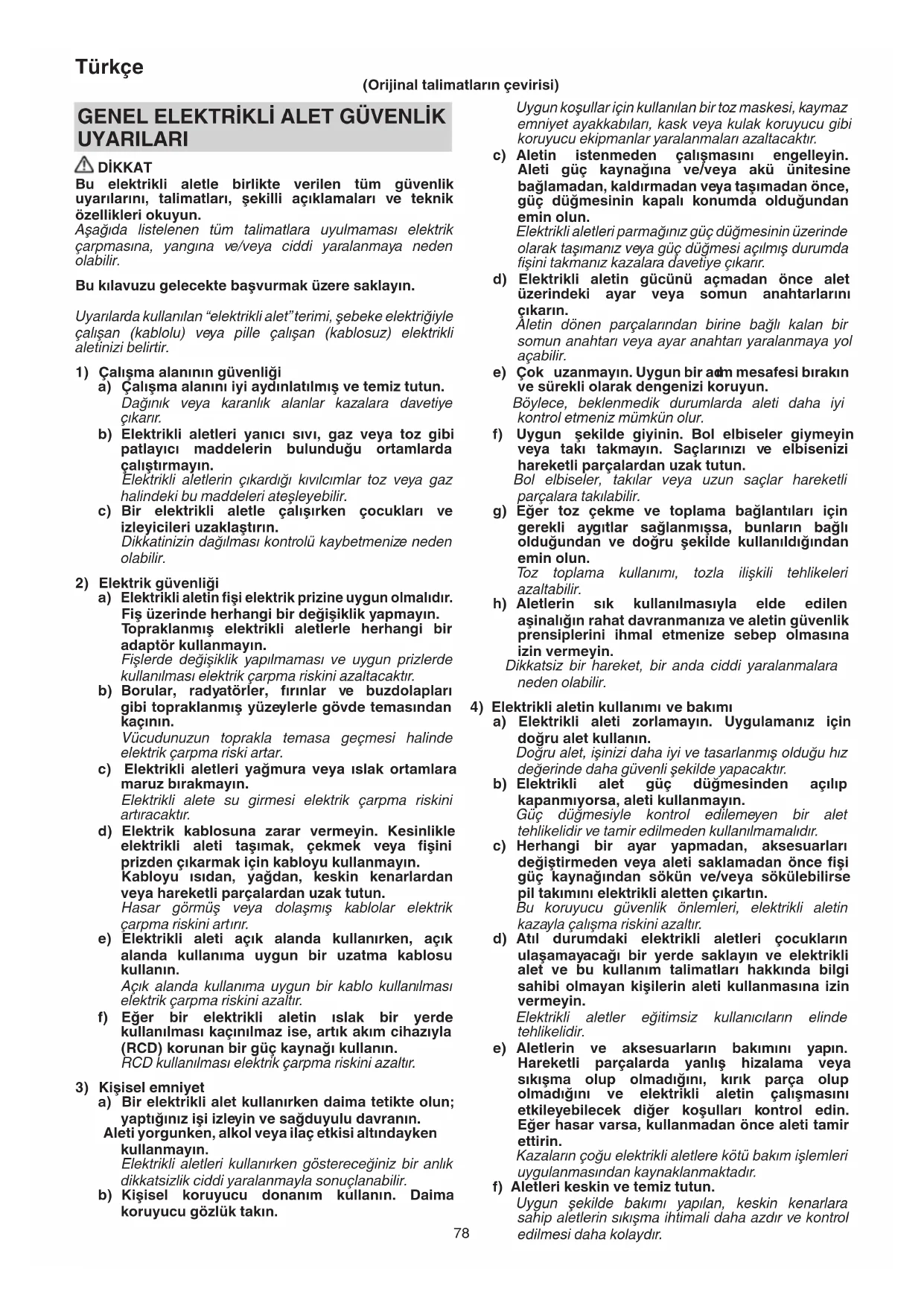 a) Bir elektrikli alet kullanırken daima tetikte olun; yaptığınız işi izleyin ve sağduyulu davranın. Aleti yorgunken, alkol veya ilaç etkisi altındayken kullanmayın. Elektrikli aletleri kullanırken göstereceğiniz bir anlık dikkatsizlik ciddi yaralanmayla sonuçlanabilir. b) Kişisel koruyucu donanım kullanı n. Daima koruyucu gözlük takın. (Orijinal talimatların çevirisi) 0000BookSV15YCEU.indb780000BookSV15YCEU.indb78 2017/12/0816:42:392017/12/0816:42:3979 Türkçe g) Elektrikli aleti, aksesuarları, uçları, v.b., bu talimatlara uygun şekilde, çalışma koşullarını ve yapılacak işi göz önünde bulundurarak kullanın. Elektrikli aletin amaçlanan kullanımlardan farklı işlemler için kullanılması tehlikeli bir duruma yol açabilir. h) Tutamakları ve kavrama yüzeylerini kuru, temiz, yağsız ve gressiz tutun. Kaygan tutamaklar ve kavrama yüzeyleri, beklenmedik durumlarda aletin güvenli bir şekilde idare ve kontrol edilmesine izin vermez.