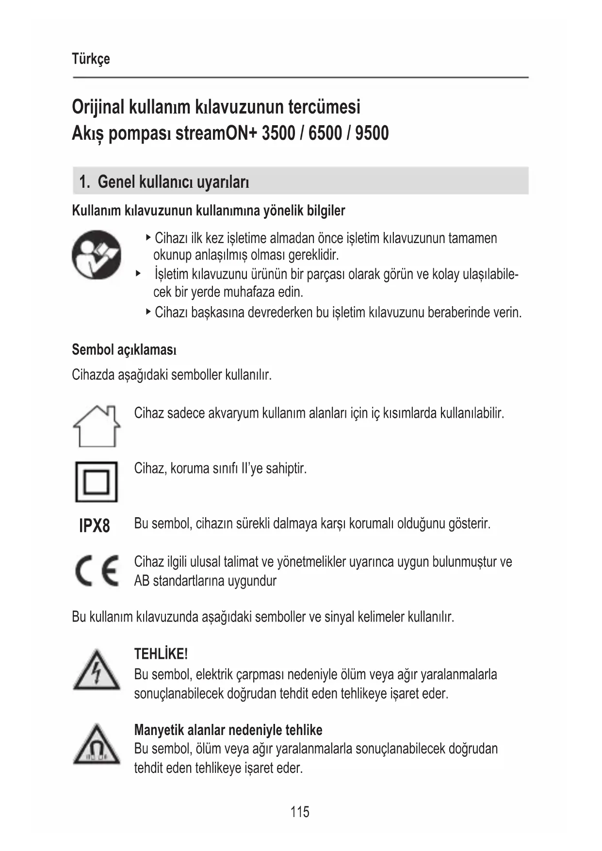 Kullanım kılavuzunun kullanımına yönelik bilgiler ▶ Cihazı ilk kez işletime almadan önce işletim kılavuzunun tamamen okunup anlaşılmış olması gereklidir. ▶ İşletim kılavuzunu ürünün bir parçası olarak görün ve kolay ulaşılabile- cek bir yerde muhafaza edin. ▶ Cihazı başkasına devrederken bu işletim kılavuzunu beraberinde verin. Sembol açıklaması Cihazda aşağıdaki semboller kullanılır. Cihaz sadece akvaryum kullanım alanları için iç kısımlarda kullanılabilir. Cihaz, koruma sınıfı II’ye sahiptir. Bu sembol, cihazın sürekli dalmaya karşı korumalı olduğunu gösterir. Cihaz ilgili ulusal talimat ve yönetmelikler uyarınca uygun bulunmuştur ve AB standartlarına uygundur Bu kullanım kılavuzunda aşağıdaki semboller ve sinyal kelimeler kullanılır. TEHLİKE! Bu sembol, elektrik çarpması nedeniyle ölüm veya ağır yaralanmalarla sonuçlanabilecek doğrudan tehdit eden tehlikeye işaret eder. Manyetik alanlar nedeniyle tehlike Bu sembol, ölüm veya ağır yaralanmalarla sonuçlanabilecek doğrudan tehdit eden tehlikeye işaret eder. IPX8Türkçe