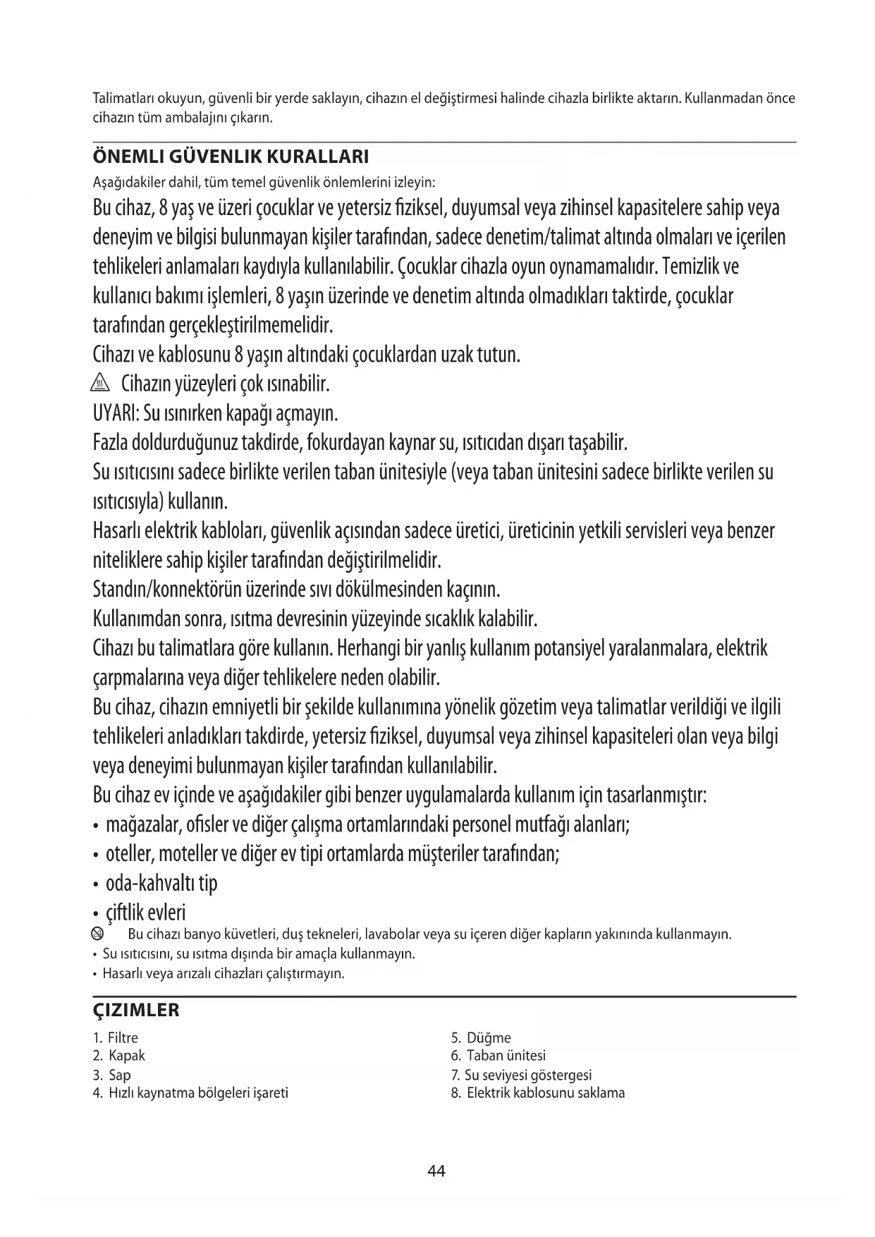 Aşağıdakiler dahil, tüm temel güvenlik önlemlerini izleyin: Bu cihaz, 8 yaş ve üzeri çocuklar ve yetersiz ziksel, duyumsal veya zihinsel kapasitelere sahip veya deneyim ve bilgisi bulunmayan kişiler tarafından, sadece denetim/talimat altında olmaları ve içerilen tehlikeleri anlamaları kaydıyla kullanılabilir. Çocuklar cihazla oyun oynamamalıdır. Temizlik ve kullanıcı bakımı işlemleri, 8 yaşın üzerinde ve denetim altında olmadıkları taktirde, çocuklar tarafından gerçekleştirilmemelidir. Cihazı ve kablosunu 8 yaşın altındaki çocuklardan uzak tutun. h Cihazın yüzeyleri çok ısınabilir. UYARI: Su ısınırken kapağı açmayın. Fazla doldurduğunuz takdirde, fokurdayan kaynar su, ısıtıcıdan dışarı taşabilir. Su ısıtıcısını sadece birlikte verilen taban ünitesiyle (veya taban ünitesini sadece birlikte verilen su ısıtıcısıyla) kullanın. Hasarlı elektrik kabloları, güvenlik açısından sadece üretici, üreticinin yetkili servisleri veya benzer niteliklere sahip kişiler tarafından değiştirilmelidir. Standın/konnektörün üzerinde sıvı dökülmesinden kaçının. Kullanımdan sonra, ısıtma devresinin yüzeyinde sıcaklık kalabilir. Cihazı bu talimatlara göre kullanın. Herhangi bir yanlış kullanım potansiyel yaralanmalara, elektrik çarpmalarına veya diğer tehlikelere neden olabilir. Bu cihaz, cihazın emniyetli bir şekilde kullanımına yönelik gözetim veya talimatlar verildiği ve ilgili tehlikeleri anladıkları takdirde, yetersiz ziksel, duyumsal veya zihinsel kapasiteleri olan veya bilgi veya deneyimi bulunmayan kişiler tarafından kullanılabilir. Bu cihaz ev içinde ve aşağıdakiler gibi benzer uygulamalarda kullanım için tasarlanmıştır:
