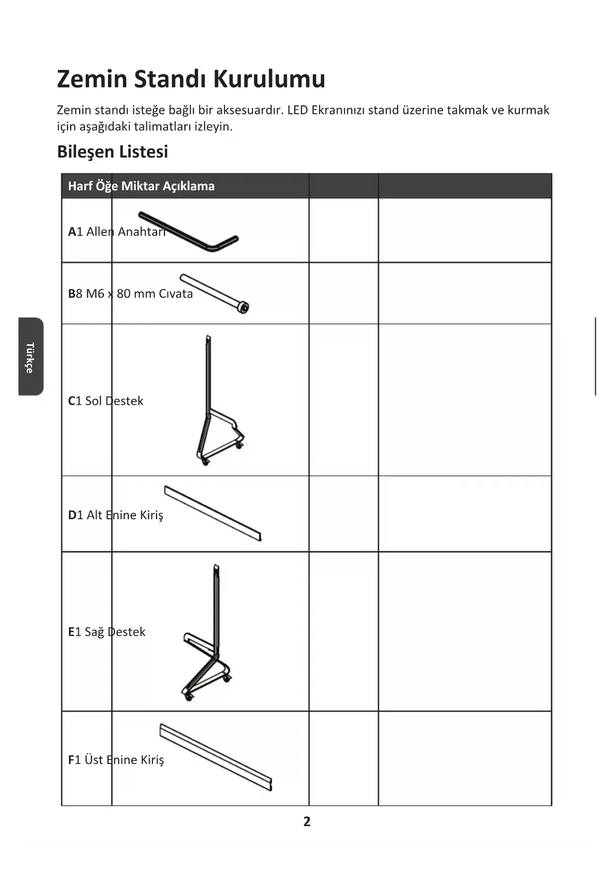 HDMI OUT USBUSBUSBRS2322 Türkçe Zemin Standı Kurulumu Zemin standı isteğe bağlı bir aksesuardır. LED Ekranınızı stand üzerine takmak ve kurmak için aşağıdaki talimatları izleyin. Bileşen Listesi Harf Öğe Miktar Açıklama A 1 Allen Anahtarı B 8 M6 x 80 mm Cıvata C 1 Sol Destek D 1 Alt Enine Kiriş E 1 Sağ Destek F 1 Üst Enine Kiriş3 Türkçe 2233.3 mm