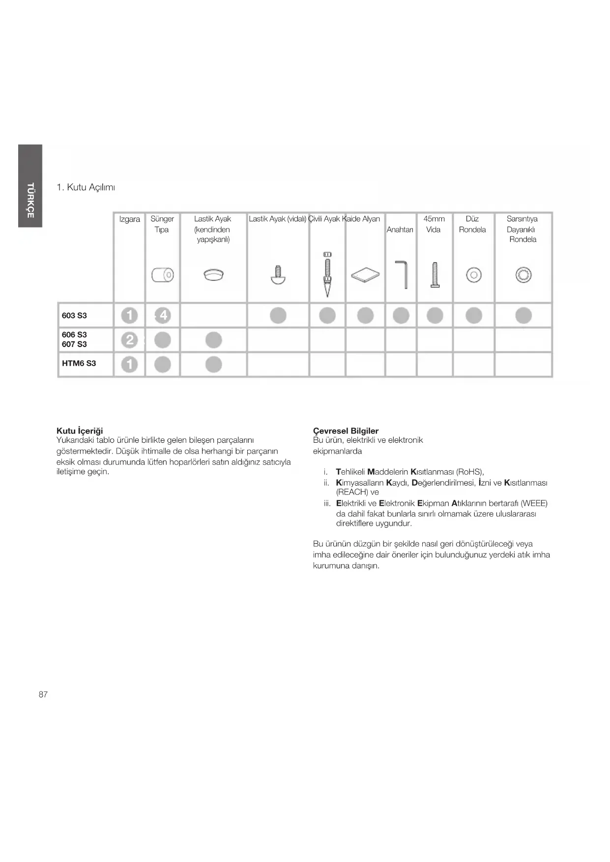 Kutu İçeriği Yukarıdaki tablo ürünle birlikte gelen bileşen parçalarını göstermektedir. Düşük ihtimalle de olsa herhangi bir parçanın eksik olması durumunda lütfen hoparlörleri satın aldığınız satıcıyla iletişime geçin. Çevresel Bilgiler Bu ürün, elektrikli ve elektronik ekipmanlarda