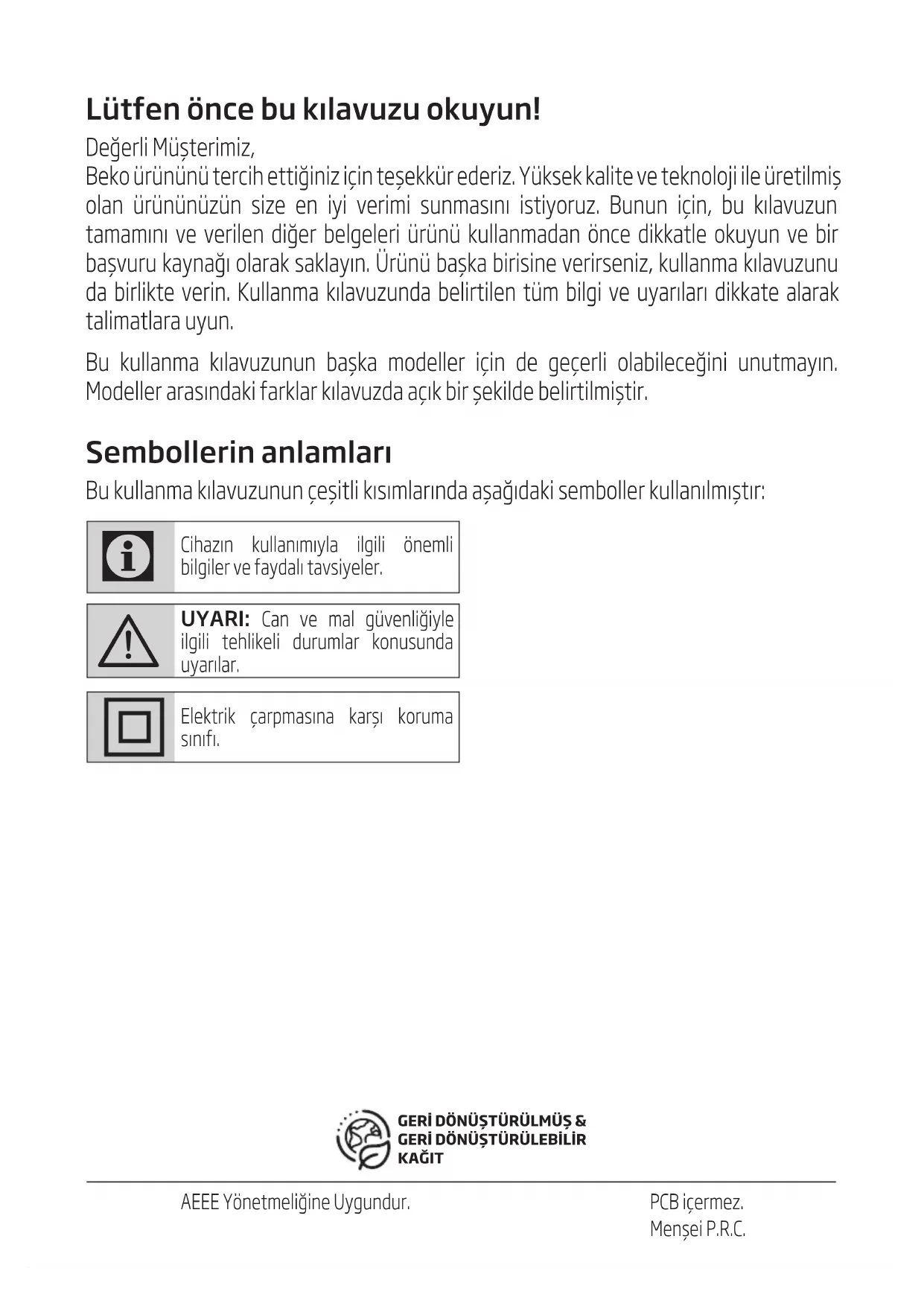 UYARI: Can ve mal güvenlğyle lgl tehlkel durumlar konusunda uyarılar. Elektrk çarpmasına karşı koruma sınıfı. AEEE Yönetmelğne Uygundur. PCB çermez. Menşe P.R.C. GERİ DÖNÜŞTÜRÜLMÜŞ & GERİ DÖNÜŞTÜRÜLEBİLİR KAĞITElektrikli Süpürge / Kullanma Kılavuzu 11 / TR Bu bölümde, yaralanma ya da maddi hasar tehlikelerini önlemeye yardımcı olacak güvenlik talimatları yer almaktadır. Bu talimatlara uyulmaması halinde her türlü garanti geçersiz hale gelir.
