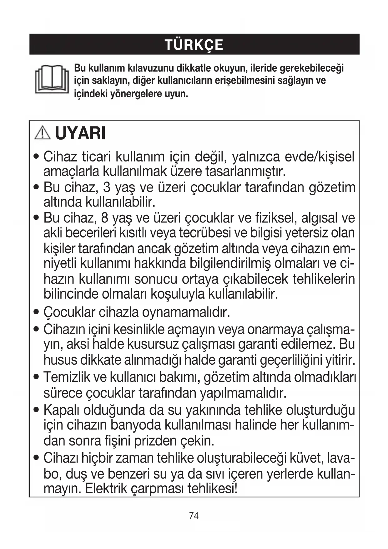 Bu cihaz, 8 yaş ve üzeri çocuklar ve fiziksel, algısal ve akli becerileri kısıtlı veya tecrübesi ve bilgisi yetersiz olan kişiler tarafından ancak gözetim altında veya cihazın em- niyetli kullanımı hakkında bilgilendirilmiş olmaları ve ci- hazın kullanımı sonucu ortaya çıkabilecek tehlikelerin bilincinde olmaları koşuluyla kullanılabilir.