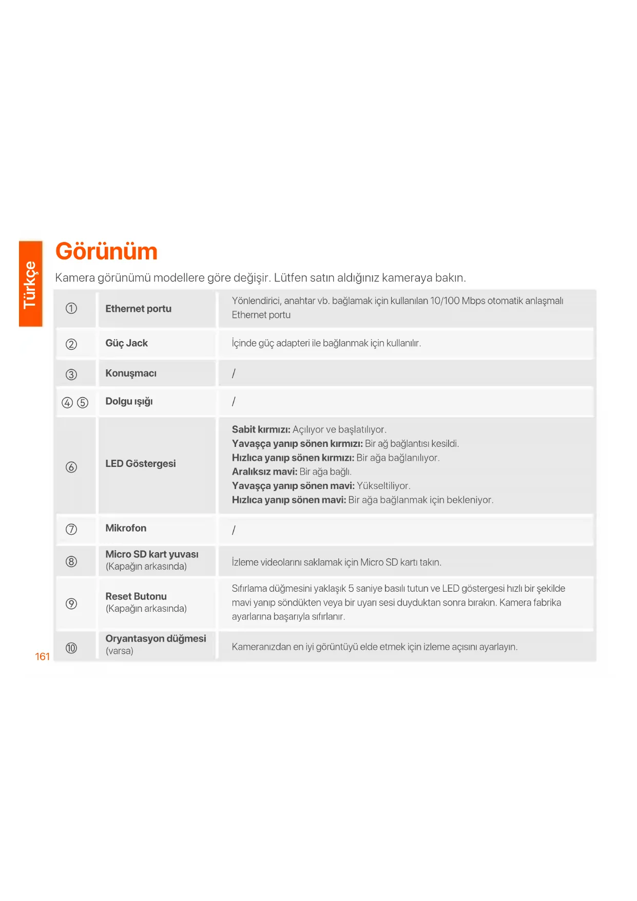 İçinde güç adapteri ile bağlanmak için kullanılır. Yönlendirici, anahtar vb. bağlamak için kullanılan 10/100 Mbps otomatik anlaşmalı Ethernet portu Sabit kırmızı: Açılıyor ve başlatılıyor. Yavaşça yanıp sönen kırmızı: Bir ağ bağlantısı kesildi. Hızlıca yanıp sönen kırmızı: Bir ağa bağlanılıyor. Aralıksız mavi: Bir ağa bağlı. Yavaşça yanıp sönen mavi: Yükseltiliyor. Hızlıca yanıp sönen mavi: Bir ağa bağlanmak için bekleniyor. İzleme videolarını saklamak için Micro SD kartı takın. Sıfırlama düğmesini yaklaşık 5 saniye basılı tutun ve LED göstergesi hızlı bir şekilde mavi yanıp söndükten veya bir uyarı sesi duyduktan sonra bırakın. Kamera fabrika ayarlarına başarıyla sıfırlanır. Kameranızdan en iyi görüntüyü elde etmek için izleme açısını ayarlayın. Dolgu ışığı LED Göstergesi Mikrofon Konuşmacı