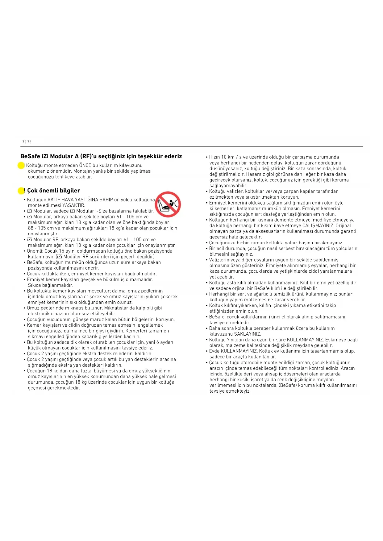 - Çocuğun 18 kg’dan daha fazla büyümesi ya da omuz yüksekliğinin omuz kayışlarının en yüksek konumundan daha yüksek hale gelmesi durumunda, çocuğun 18 kg üzerinde çocuklar için uygun bir koltuğa geçmesi gerekmektedir. BeSafe iZi Modular A (RF)’u seçtiğiniz için teşekkür ederiz ! Koltuğu monte etmeden ÖNCE bu kullanım kılavuzunu okumanız önemlidir. Montajın yanlış bir şekilde yapılması çocuğunuzu tehlikeye atabilir.