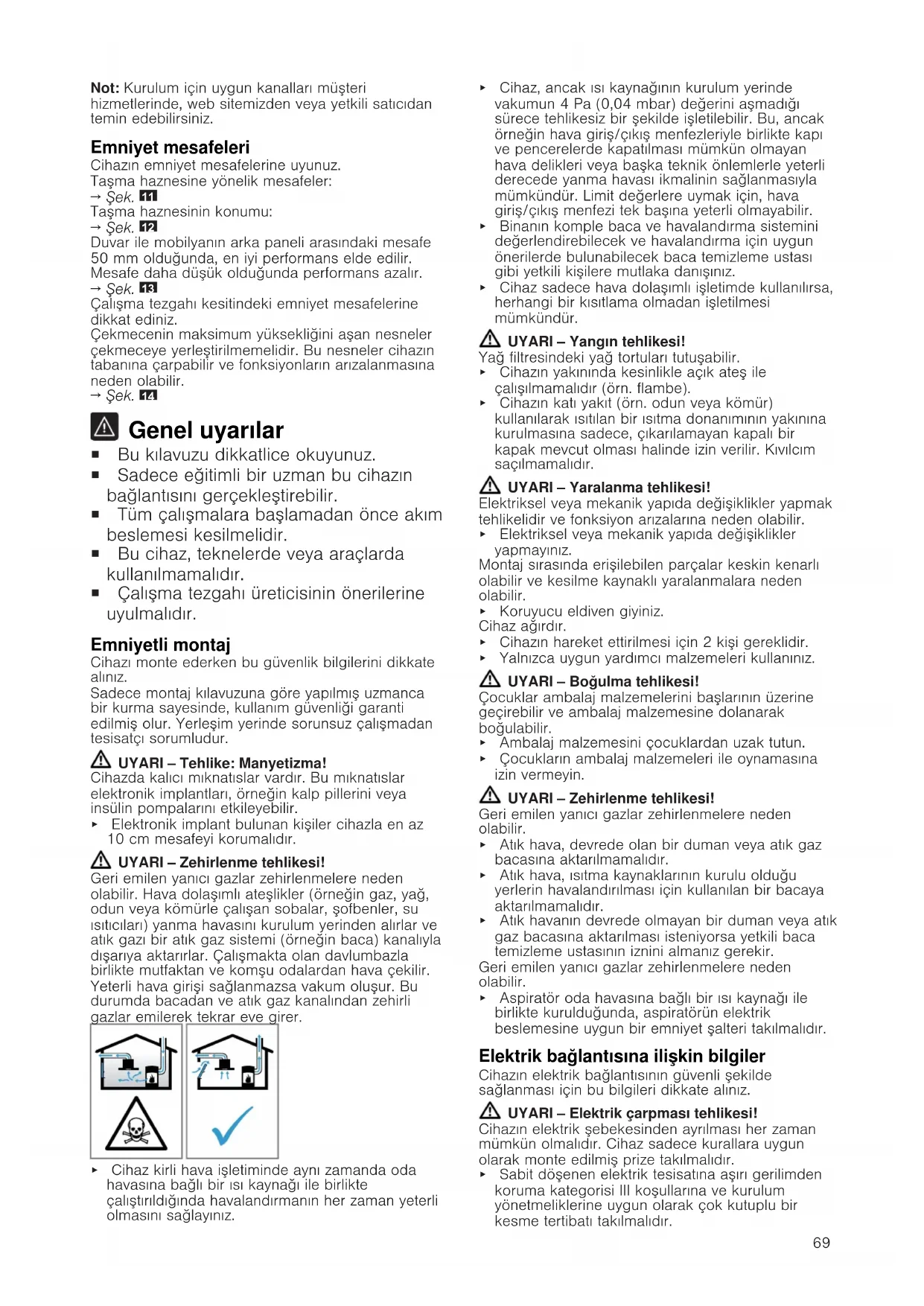 Genel uyarılar ¡ Bu kılavuzu dikkatlice okuyunuz. ¡ Sadece eğitimli bir uzman bu cihazın bağlantısını gerçekleştirebilir. ¡ Tüm çalışmalara başlamadan önce akım beslemesi kesilmelidir. ¡ Bu cihaz, teknelerde veya araçlarda kullanılmamalıdır. ¡ Çalışma tezgahı üreticisinin önerilerine uyulmalıdır. Emniyetli montaj Cihazı monte ederken bu güvenlik bilgilerini dikkate alınız. Sadece montaj kılavuzuna göre yapılmış uzmanca bir kurma sayesinde, kullanım güvenliği garanti edilmiş olur. Yerleşim yerinde sorunsuz çalışmadan tesisatçı sorumludur. UYARI‒Tehlike: Manyetizma! Cihazda kalıcı mıknatıslar vardır. Bu mıknatıslar elektronik implantları, örneğin kalp pillerini veya insülin pompalarını etkileyebilir. ▶ Elektronik implant bulunan kişiler cihazla en az 10cm mesafeyi korumalıdır. UYARI‒Zehirlenme tehlikesi! Geri emilen yanıcı gazlar zehirlenmelere neden olabilir. Hava dolaşımlı ateşlikler (örneğin gaz, yağ, odun veya kömürle çalışan sobalar, şofbenler, su ısıtıcıları) yanma havasını kurulum yerinden alırlar ve atık gazı bir atık gaz sistemi (örneğin baca) kanalıyla dışarıya aktarırlar. Çalışmakta olan davlumbazla birlikte mutfaktan ve komşu odalardan hava çekilir. Yeterli hava girişi sağlanmazsa vakum oluşur. Bu durumda bacadan ve atık gaz kanalından zehirli gazlar emilerek tekrar eve girer. ▶ Cihaz kirli hava işletiminde aynı zamanda oda havasına bağlı bir ısı kaynağı ile birlikte çalıştırıldığında havalandırmanın her zaman yeterli olmasını sağlayınız. ▶ Cihaz, ancak ısı kaynağının kurulum yerinde vakumun 4Pa(0,04mbar) değerini aşmadığı sürece tehlikesiz bir şekilde işletilebilir. Bu, ancak örneğin hava giriş/çıkış menfezleriyle birlikte kapı ve pencerelerde kapatılması mümkün olmayan hava delikleri veya başka teknik önlemlerle yeterli derecede yanma havası ikmalinin sağlanmasıyla mümkündür. Limit değerlere uymak için, hava giriş/çıkış menfezi tek başına yeterli olmayabilir. ▶ Binanın komple baca ve havalandırma sistemini değerlendirebilecek ve havalandırma için uygun önerilerde bulunabilecek baca temizleme ustası gibi yetkili kişilere mutlaka danışınız. ▶ Cihaz sadece hava dolaşımlı işletimde kullanılırsa, herhangi bir kısıtlama olmadan işletilmesi mümkündür. UYARI‒Yangın tehlikesi! Yağ filtresindeki yağ tortuları tutuşabilir. ▶ Cihazın yakınında kesinlikle açık ateş ile çalışılmamalıdır (örn.flambe). ▶ Cihazın katı yakıt (örn. odun veya kömür) kullanılarak ısıtılan bir ısıtma donanımının yakınına kurulmasına sadece, çıkarılamayan kapalı bir kapak mevcut olması halinde izin verilir. Kıvılcım saçılmamalıdır. UYARI‒Yaralanma tehlikesi! Elektriksel veya mekanik yapıda değişiklikler yapmak tehlikelidir ve fonksiyon arızalarına neden olabilir. ▶ Elektriksel veya mekanik yapıda değişiklikler yapmayınız. Montaj sırasında erişilebilen parçalar keskin kenarlı olabilir ve kesilme kaynaklı yaralanmalara neden olabilir. ▶ Koruyucu eldiven giyiniz. Cihaz ağırdır. ▶ Cihazın hareket ettirilmesi için 2 kişi gereklidir. ▶ Yalnızca uygun yardımcı malzemeleri kullanınız. UYARI‒Boğulma tehlikesi! Çocuklar ambalaj malzemelerini başlarının üzerine geçirebilir ve ambalaj malzemesine dolanarak boğulabilir. ▶ Ambalaj malzemesini çocuklardan uzak tutun. ▶ Çocukların ambalaj malzemeleri ile oynamasına izin vermeyin. UYARI‒Zehirlenme tehlikesi! Geri emilen yanıcı gazlar zehirlenmelere neden olabilir. ▶ Atık hava, devrede olan bir duman veya atık gaz bacasına aktarılmamalıdır. ▶ Atık hava, ısıtma kaynaklarının kurulu olduğu yerlerin havalandırılması için kullanılan bir bacaya aktarılmamalıdır. ▶ Atık havanın devrede olmayan bir duman veya atık gaz bacasına aktarılması isteniyorsa yetkili baca temizleme ustasının iznini almanız gerekir. Geri emilen yanıcı gazlar zehirlenmelere neden olabilir. ▶ Aspiratör oda havasına bağlı bir ısı kaynağı ile birlikte kurulduğunda, aspiratörün elektrik beslemesine uygun bir emniyet şalteri takılmalıdır. Elektrik bağlantısına ilişkin bilgiler Cihazın elektrik bağlantısının güvenli şekilde sağlanması için bu bilgileri dikkate alınız. UYARI‒Elektrik çarpması tehlikesi! Cihazın elektrik şebekesinden ayrılması her zaman mümkün olmalıdır. Cihaz sadece kurallara uygun olarak monte edilmiş prize takılmalıdır. ▶ Sabit döşenen elektrik tesisatına aşırı gerilimden koruma kategorisi III koşullarına ve kurulum yönetmeliklerine uygun olarak çok kutuplu bir kesme tertibatı takılmalıdır.70 ▶ Sabit elektrik tesisatının sadece bir elektrik teknisyeni tarafından gerçekleştirmesi gerekir. Güç kaynağının akım devresine kaçak akım koruma şalteri (RCD) montajı yapmanızı öneririz. ¡ Bağlantı kablosu katlanmamalı veya sıkıştırılmamalı ve keskin cisimlerden uzak tutulmalıdır. ¡ Bağlantı kablosu, sıcak cihaz gövdelerine temas etmeyecek şekilde döşenmelidir. ¡ Sadece cihazla teslim edilen veya teknik müşteri hizmetlerinden tedarik edilen bağlantı kablosu kullanılmalıdır. ¡ Bu cihaz, AB parazitlenme giderme yönetmeliklerine uygundur. ¡ Cihaz koruma sınıfı 1'e aittir. Bu nedenle yalnızca topraklama kablosu bağlantısı kullanılmalıdır. ¡ Hatalı bir elektrik tesisatından kaynaklanan işletme arızaları veya olası hasarlarda üretici hiçbir şekilde sorumluluk kabul etmez. Elektrik bağlantısının hazırlanması Gereklilik:Yalnızca ilgili eğitimi almış müşteri hizmetleri personeli, cihazın iç kısmındaki çalışmaları yapabilir veya güç kablosunu değiştirebilir.