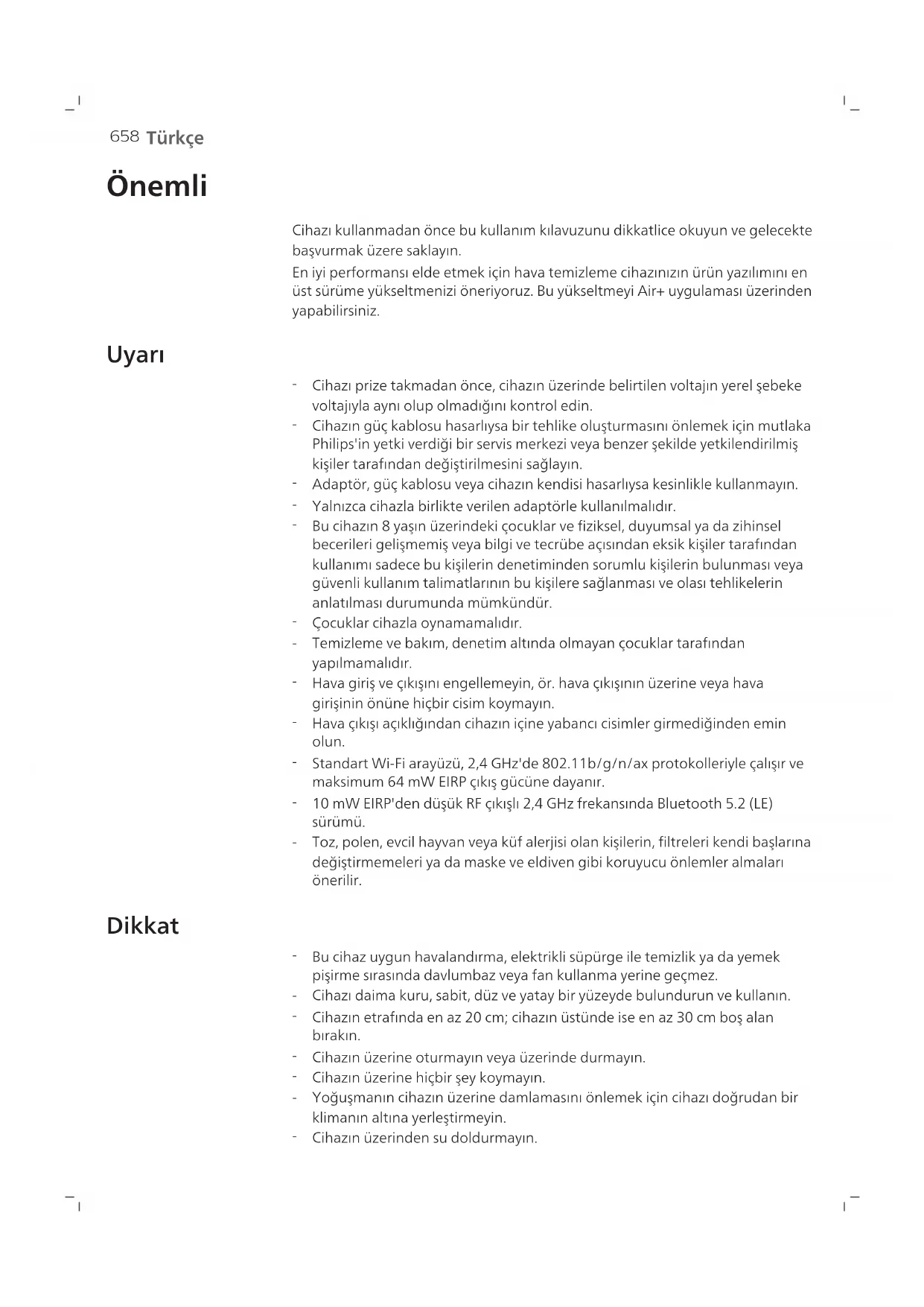 Türkçe Önemli Cihazı kullanmadan önce bu kullanım kılavuzunu dikkatlice okuyun ve gelecekte başvurmak üzere saklayın. En iyi performansı elde etmek için hava temizleme cihazınızın ürün yazılımını en üst sürüme yükseltmenizi öneriyoruz. Bu yükseltmeyi Air+ uygulaması üzerinden yapabilirsiniz. Uyarı