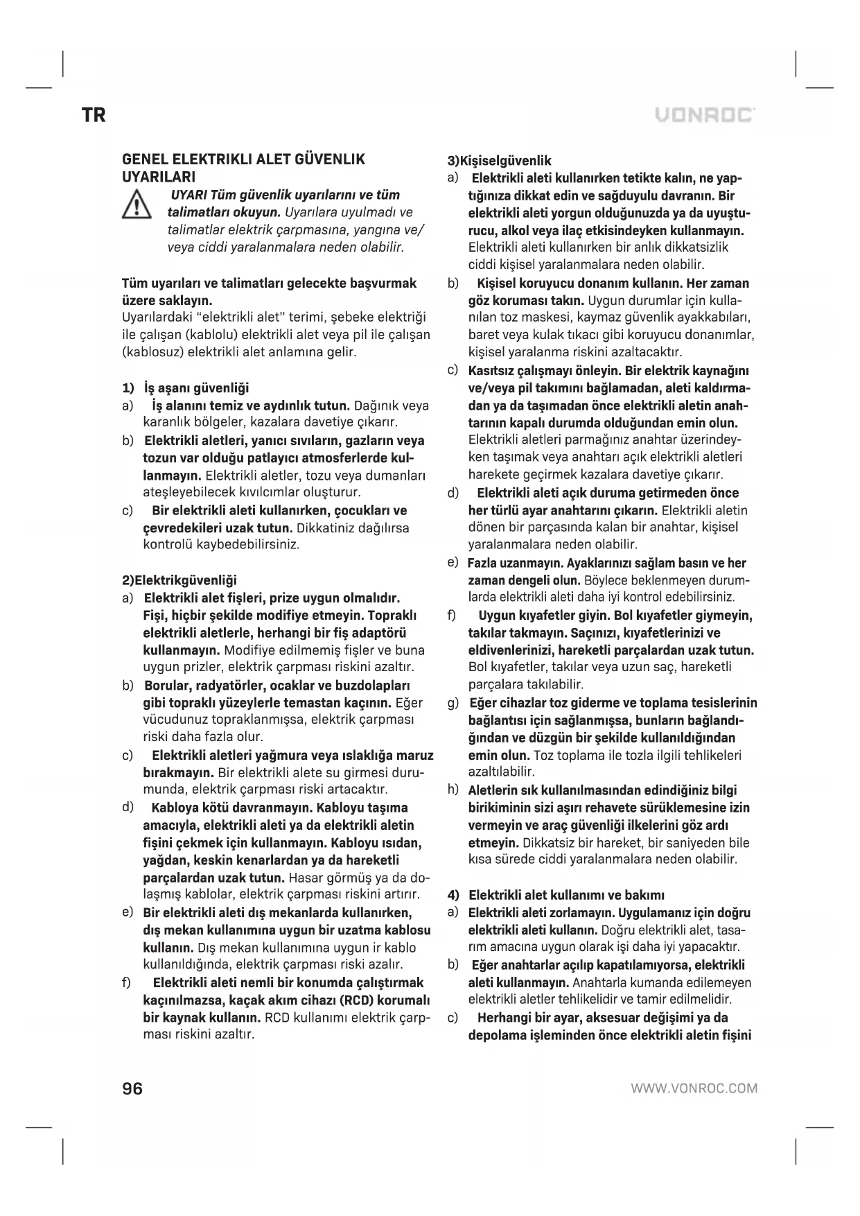 leri kullanmayın. Bunlar gibi kimyasallar sentetik bileşenlere zarar verecektir. ÇEVRE Arızalı ve/veya atılmış elektrkl veya elektro- nk ekpmanların uygun ger dönüşüm konumlarında toplanması gerekr. Yalnızca AT ülkeleri için Elektrkl aletler evsel atık olarak atmayın. Atık Elektrkl ve Elektronk Donanım çn Avrupa İlkeler 2012/19/EU’ya ve bunun yerel hukuk çerçevesnde uygulamasına göre, artık kullanılamaz olan elekt- rkl aletler ayrı olarak toplanmalı ve çevre dostu br yolla mha edlmeldr. GARANTİ VONROC ürünler yüksek kalte standartları doğrul- tusunda gelştrlmştr ve lk satın alımdan tbaren kanunen belrlenen süre boyunca materyal ve şçlk açısından kusursuz olacağı garant edlmektedr. Bu süre zarfında, kusurlu materyal ve/veya şçlkten dolayı üründe herhang br arıza meydana gelmes durumunda, doğrudan VONROC letşm kurun. Takp eden durumlar bu garant kapsamı dışındadır: