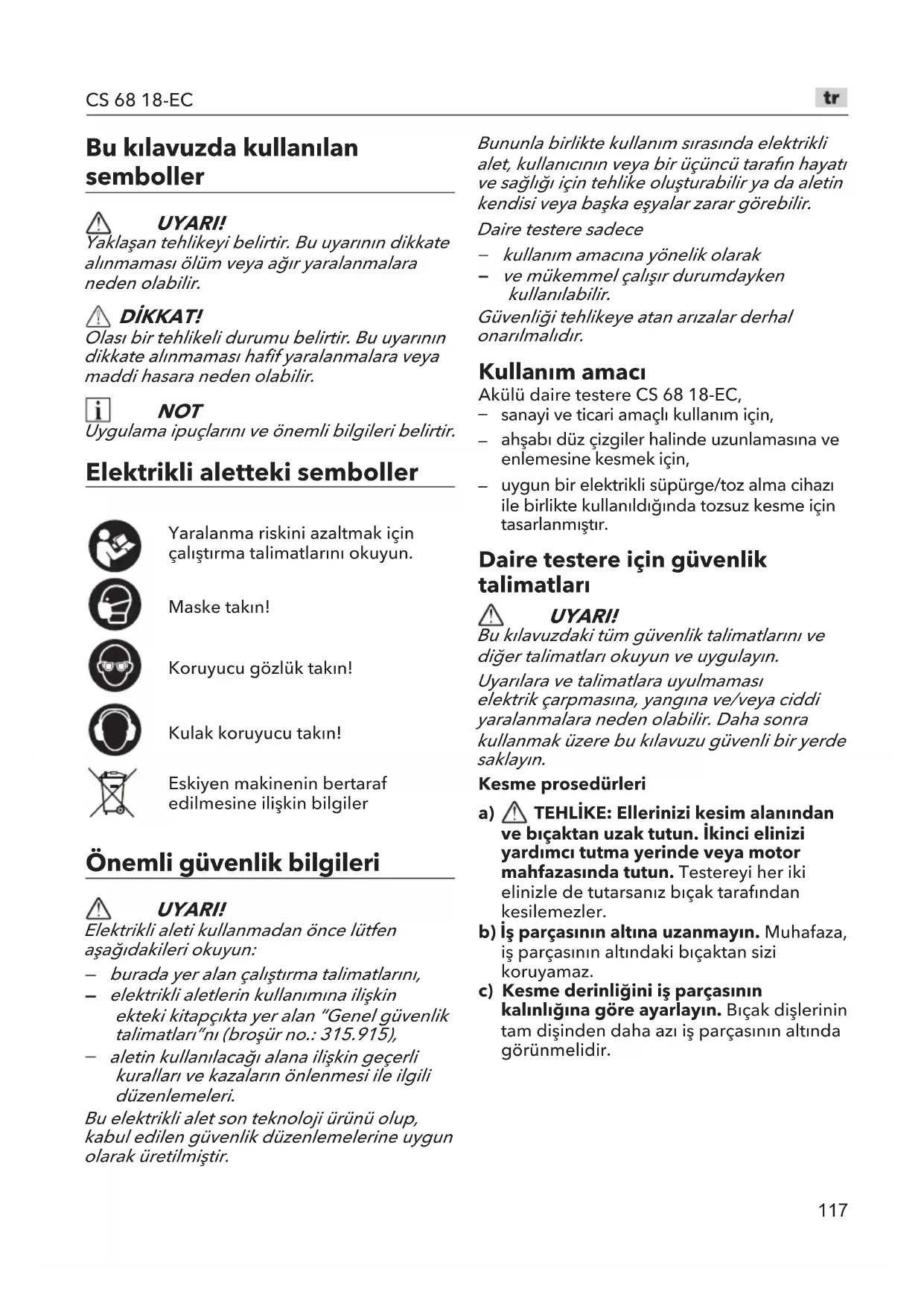 Bahnhofstrasse 15, D-71711 Steinheim/Murr Απαλλαγή ευθύνης Ο κατασκευαστής και ο εκπρόσωπός του δεν ευθύνονται για καμία ζημιά ή απώλεια κέρδους λόγω της διακοπής επαγγελματικής δραστηριότητας, η οποία επήλθε λόγω του προϊόντος ή ενός άχρηστου προϊόντος. Ο κατασκευαστής και ο εκπρόσωπός του δεν ευθύνονται για καμία ζημιά που προκλήθηκε από ακατάλληλη χρήση του προϊόντος ή από τη χρήση του προϊόντος με προϊόντα άλλων κατασκευαστών.117 CS 68 18-EC Bu kılavuzda kullanılan semboller UYARI! Yaklaşan tehlikeyi belirtir. Bu uyarının dikkate alınmaması ölüm veya ağır yaralanmalara neden olabilir. DİKKAT! Olası bir tehlikeli durumu belirtir. Bu uyarının dikkate alınmaması hafif yaralanmalara veya maddi hasara neden olabilir. NOT Uygulama ipuçlarını ve önemli bilgileri belirtir. Elektrikli aletteki semboller Yaralanma riskini azaltmak için çalıştırma talimatlarını okuyun.Maske takın!Koruyucu gözlük takın!Kulak koruyucu takın!Eskiyen makinenin bertaraf edilmesine ilişkin bilgiler Önemli güvenlik bilgileri UYARI! Elektrikli aleti kullanmadan önce lütfen aşağıdakileri okuyun: burada yer alan çalıştırma talimatlarını, elektrikli aletlerin kullanımına ilişkin ekteki kitapçıkta yer alan “Genel güvenlik talimatları”nı (broşür no.: 315.915), aletin kullanılacağı alana ilişkin geçerli kuralları ve kazaların önlenmesi ile ilgili düzenlemeleri. Bu elektrikli alet son teknoloji ürünü olup, kabul edilen güvenlik düzenlemelerine uygun olarak üretilmiştir. Bununla birlikte kullanım sırasında elektrikli alet, kullanıcının veya bir üçüncü tarafın hayatı ve sağlığı için tehlike oluşturabilir ya da aletin kendisi veya başka eşyalar zarar görebilir. Daire testere sadece kullanım amacına yönelik olarak ve mükemmel çalışır durumdayken kullanılabilir. Güvenliği tehlikeye atan arızalar derhal onarılmalıdır. Kulla nım amacı Akülü daire testere CS 68 18-EC,