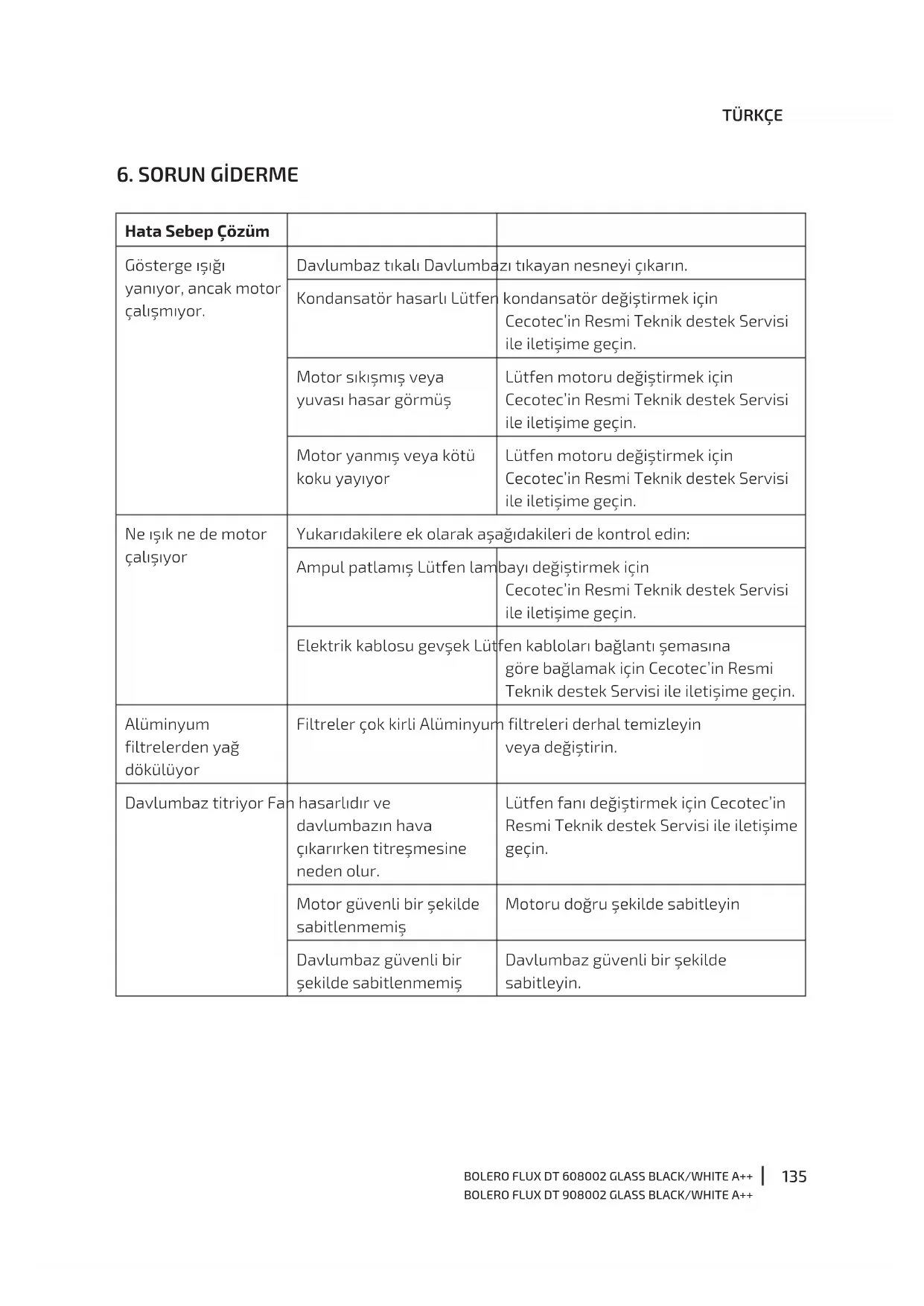 Hata Sebep Çözüm Gösterge ışığı yanıyor, ancak motor çalışmıyor. Davlumbaz tıkalı Davlumbazı tıkayan nesneyi çıkarın. Kondansatör hasarlı Lütfen kondansatör değiştirmek için Cecotec’in Resmi Teknik destek Servisi ile iletişime geçin. Motor sıkışmış veya yuvası hasar görmüş Lütfen motoru değiştirmek için Cecotec’in Resmi Teknik destek Servisi ile iletişime geçin. Motor yanmış veya kötü koku yayıyor Lütfen motoru değiştirmek için Cecotec’in Resmi Teknik destek Servisi ile iletişime geçin. Ne ışık ne de motor çalışıyor Yukarıdakilere ek olarak aşağıdakileri de kontrol edin: Ampul patlamış Lütfen lambayı değiştirmek için Cecotec’in Resmi Teknik destek Servisi ile iletişime geçin. Elektrik kablosu gevşek Lütfen kabloları bağlantı şemasına göre bağlamak için Cecotec’in Resmi Teknik destek Servisi ile iletişime geçin. Alüminyum filtrelerden yağ dökülüyor Filtreler çok kirli Alüminyum filtreleri derhal temizleyin veya değiştirin. Davlumbaz titriyor Fan hasarlıdır ve davlumbazın hava çıkarırken titreşmesine neden olur. Lütfen fanı değiştirmek için Cecotec’in Resmi Teknik destek Servisi ile iletişime geçin. Motor güvenli bir şekilde sabitlenmemiş Motoru doğru şekilde sabitleyin Davlumbaz güvenli bir şekilde sabitlenmemiş Davlumbaz güvenli bir şekilde sabitleyin.BOLERO FLUX DT 608002 GLASS BLACK/WHITE A++ BOLERO FLUX DT 908002 GLASS BLACK/WHITE A++
