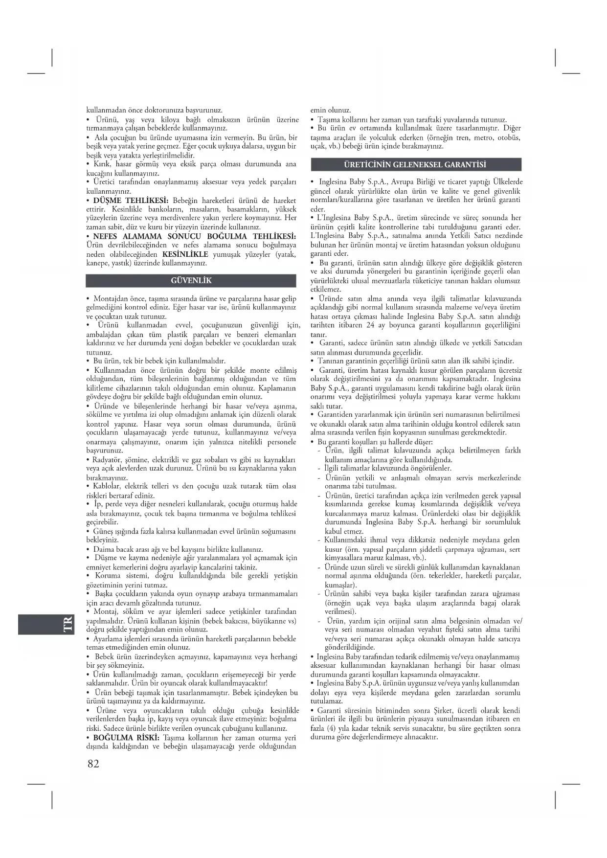 - Inglesina Baby S.p.A., Avrupa Birliği ve ticaret yaptığı Ülkelerde güncel olarak yürürlükte olan ürün ve kalite ve genel güvenlik normları/kurallarına göre tasarlanan ve üretilen her ürünü garanti eder.