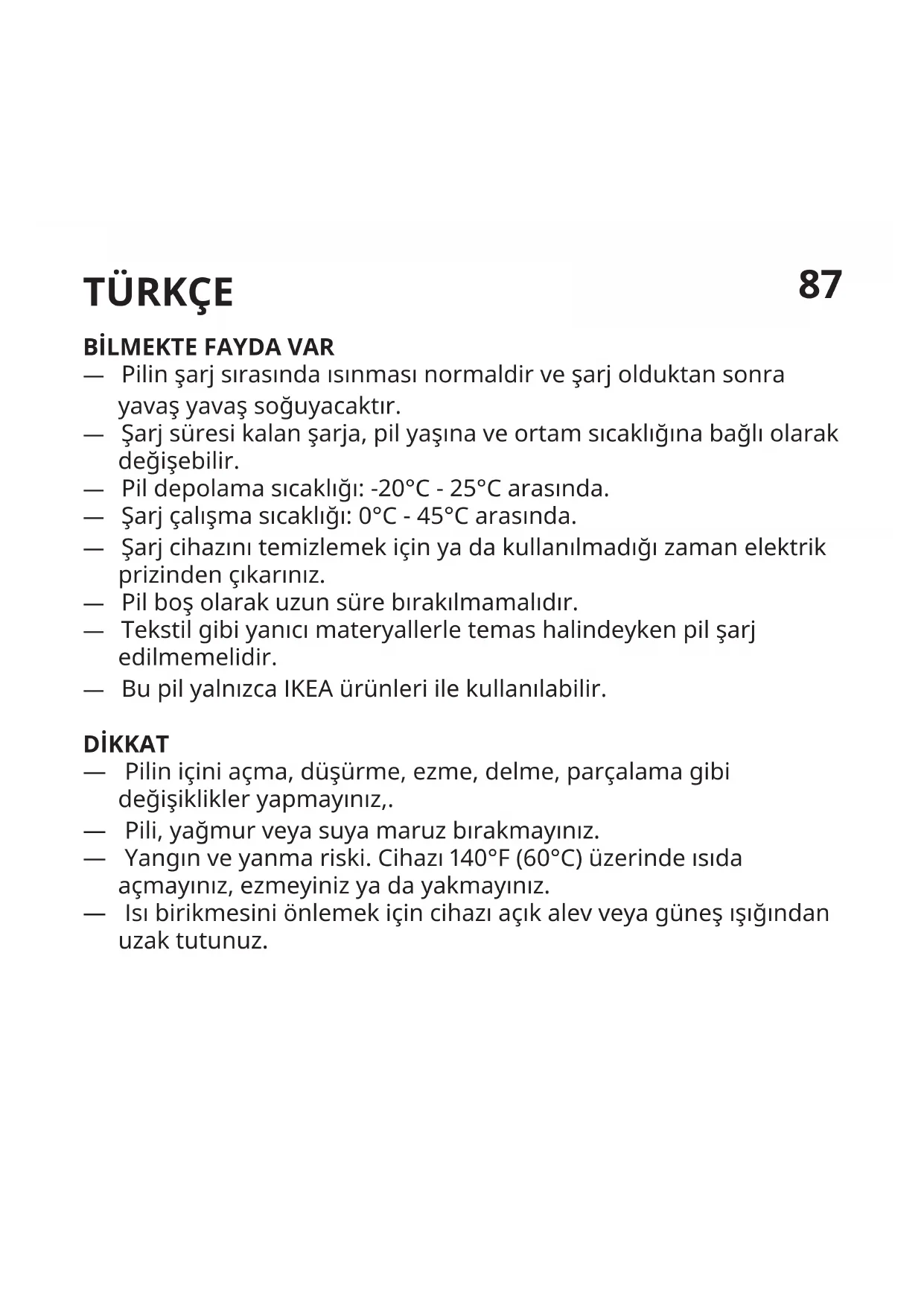 — Pilin şarj sırasında ısınması normaldir ve şarj olduktan sonra yavaş yavaş soğuyacaktır. — Şarj süresi kalan şarja, pil yaşına ve ortam sıcaklığına bağlı olarak değişebilir. — Pil depolama sıcaklığı: -20°C - 25°C arasında. — Şarj çalışma sıcaklığı: 0°C - 45°C arasında. — Şarj cihazını temizlemek için ya da kullanılmadığı zaman elektrik prizinden çıkarınız. — Pil boş olarak uzun süre bırakılmamalıdır. — Tekstil gibi yanıcı materyallerle temas halindeyken pil şarj edilmemelidir. — Bu pil yalnızca IKEA ürünleri ile kullanılabilir. DİKKAT — Pilin içini açma, düşürme, ezme, delme, parçalama gibi değişiklikler yapmayınız,. — Pili, yağmur veya suya maruz bırakmayınız. — Yangın ve yanma riski. Cihazı 140°F (60°C) üzerinde ısıda açmayınız, ezmeyiniz ya da yakmayınız. — Isı birikmesini önlemek için cihazı açık alev veya güneş ışığından uzak tutunuz.88 — Pili, yüksek gerilim cihazlarından uzak tutunuz. — Bu ürün bir oyuncak değildir, çocuklardan uzak tutunuz. Bu ürünü kullanan tüm kişilerin buradaki uyarı ve talimatları okuduğundan ve izlediğinden emin olunuz. — Cihazı ya da hücrelerini kısa devre yaptırmayınız. — Bir hücre sızıntı olması durumunda, sıvının cilt veya gözlerle temas etmesine izin vermeyiniz.