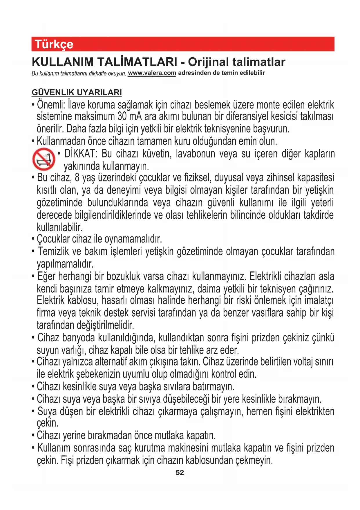 - DİKKAT: Bu cihazı küvetin, lavabonun veya su içeren diğer kapların yakınında kullanmayın.