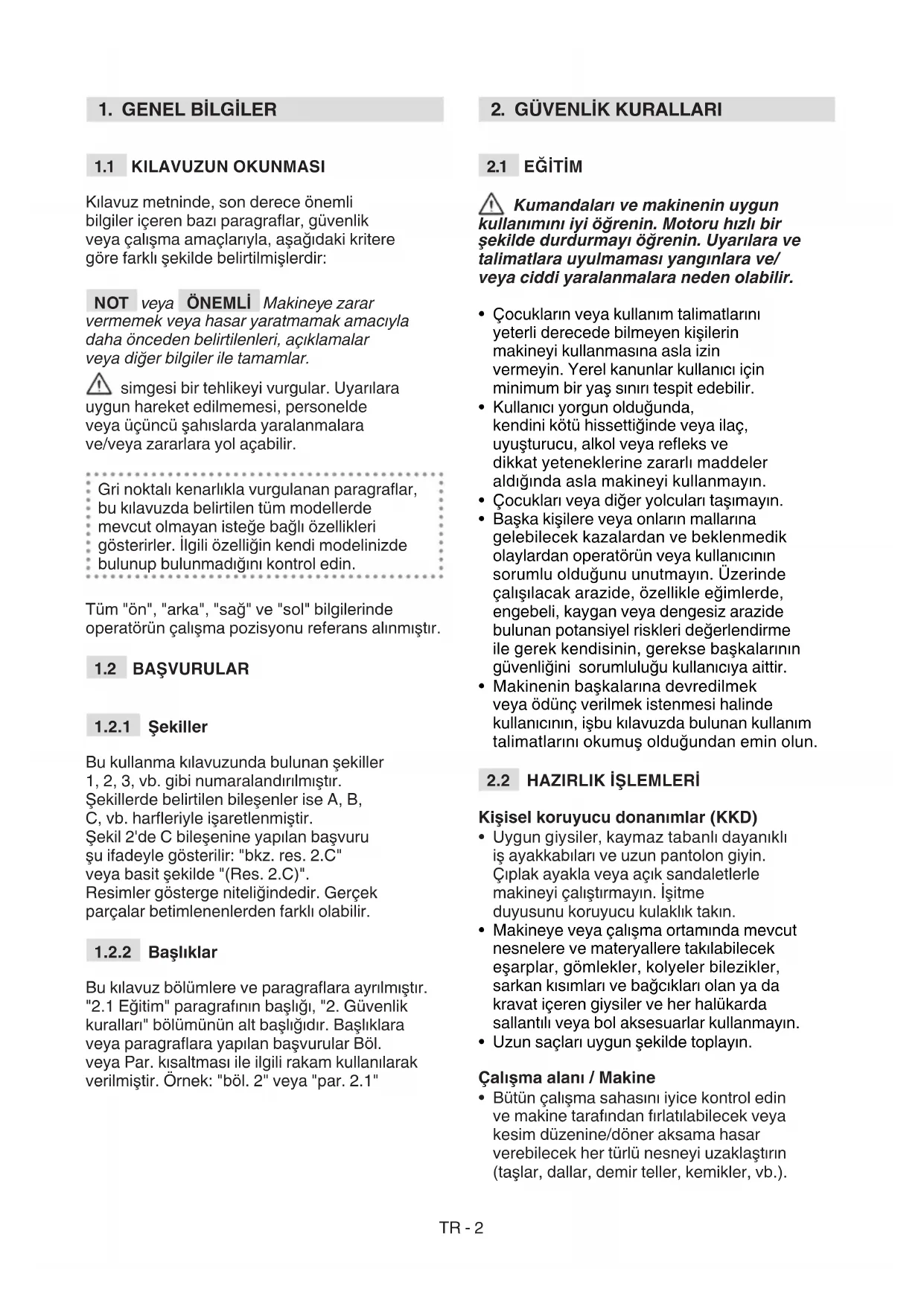 Bu kılavuz bölümlere ve paragraara ayrılmıştır. "2.1 Eğitim" paragrafının başlığı, "2. Güvenlik kuralları" bölümünün alt başlığıdır. Başlıklara veya paragraara yapılan başvurular Böl. veya Par. kısaltması ile ilgili rakam kullanılarak verilmiştir. Örnek: "böl. 2" veya "par. 2.1"