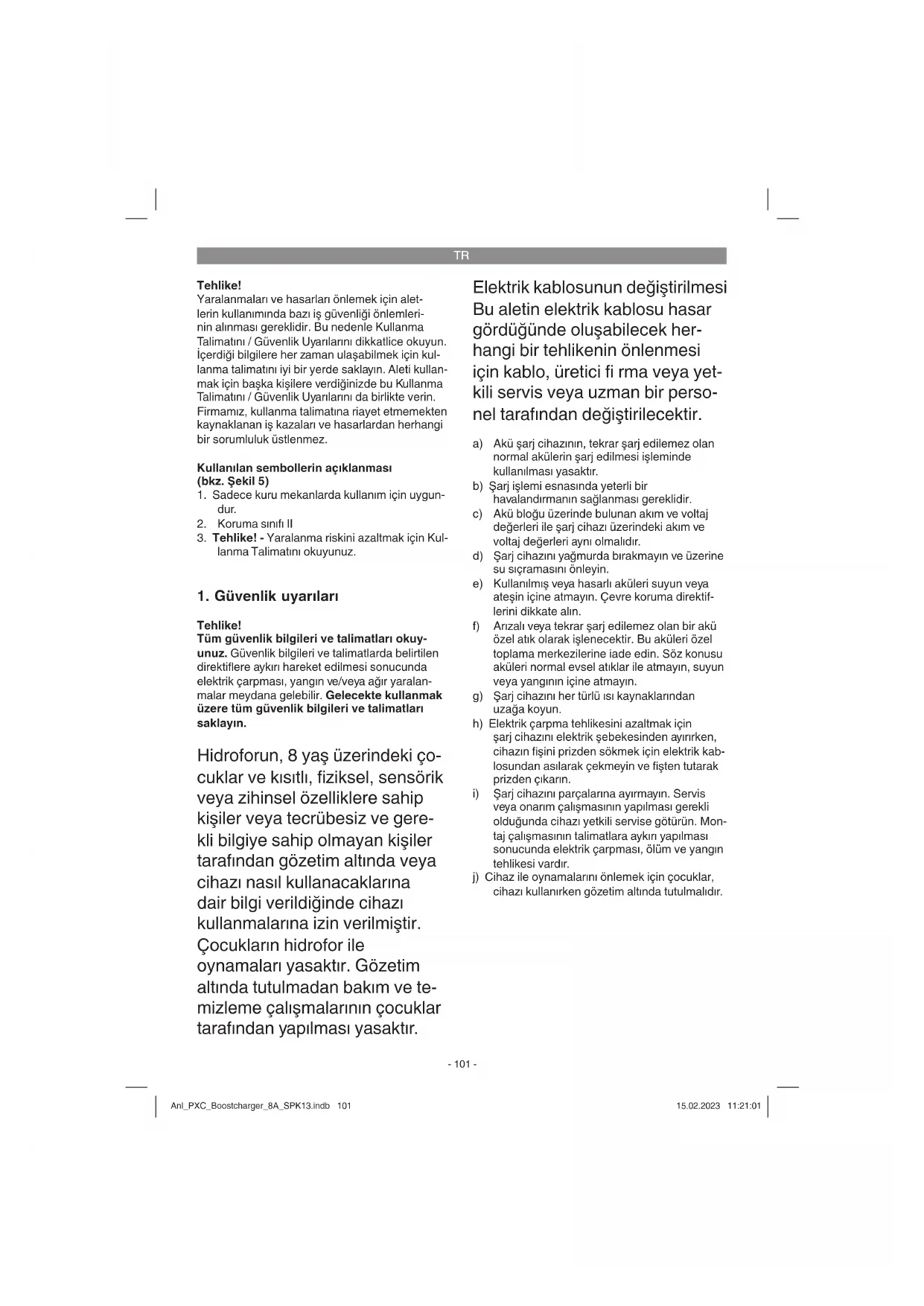 veya onarım çalışmasının yapılması gerekli olduğunda cihazı yetkili servise götürün. Mon- taj çalışmasının talimatlara aykırı yapılması sonucunda elektrik çarpması, ölüm ve yangın tehlikesi vardır. j) Cihaz ile oynamalarını önlemek için çocuklar, cihazı kullanırken gözetim altında tutulmalıdır. Anl_PXC_Boostcharger_8A_SPK13.indb 101Anl_PXC_Boostcharger_8A_SPK13.indb 101 15.02.2023 11:21:0115.02.2023 11:21:01TR