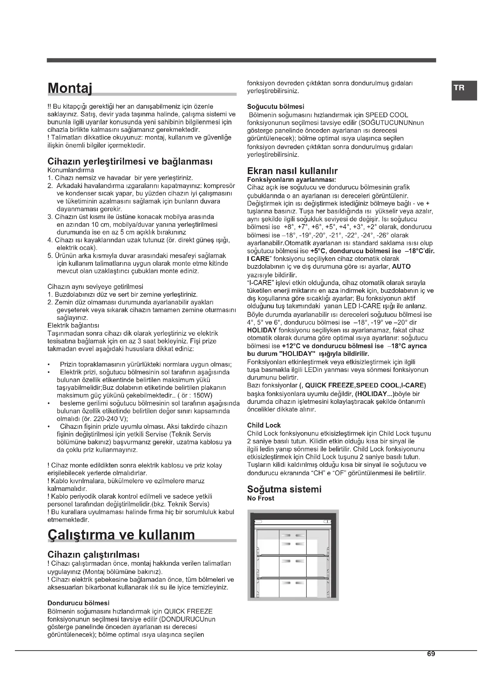 - Cihazýnfiþininprizleuyumluolmasý.Aksitakdirdecihazýn fiþinindeðiþtirilmesiiçinyetkiliServise(TeknikServis bölümünebakýnýz)baþvurmanýzgerekir,uzatmakablosuya daçokluprizkullanmayýnýz. !Cihazmonteedildiktensonraelektrikkablosuveprizkolay eriþilebilecekyerlerdeolmalýdýrlar. !Kablokývrýlmalara,bükülmelereveezilmeleremaruz kalmamalýdýr. !Kabloperiyodikolarakkontroledilmelivesadeceyetkili personeltarafýndandeðiþtirilmelidir.(bkz.TeknikServis) !Bukurallarauyulmamasýhalindefirmahiçbirsorumluluk kabul etmemektedir. Çalýþtýrma ve kullaným Cihazýn çalýþtýrýlmasý !Cihazýçalýþtýrmadanönce,montajhakkýndaverilentalimatlarý uygulayýnýz(Montajbölümünebakýnýz). !Cihazýelektrikþebekesinebaðlamadanönce,tümbölmelerive aksesuarlarýbikarbonatkullanarakýlýksuileiyicetemizleyiniz. Dondurucu bölmesi BölmeninsoðumasýnýhýzlandýrmakiçinQUICKFREEZE fonksiyonununseçilmesitavsiyeedilir(DONDURUCUnun göstergepanelindeöncedenayarlananýsýderecesi görüntülenecek);bölmeoptimalýsýyaulaþýncaseçilen fonksiyondevredençýktýktansonradondurulmuþgýdalarý yerleþtirebilirsiniz. Soğucutu bölmesi BölmeninsoðumasýnýhýzlandýrmakiçinSPEEDCOOL fonksiyonununseçilmesitavsiyeedilir(SOĞUTUCUNUNnun göstergepanelindeöncedenayarlananýsýderecesi görüntülenecek);bölmeoptimalýsýyaulaþýncaseçilen fonksiyondevredençýktýktansonradondurulmuþgýdalarý yerleþtirebilirsiniz. Ekran nasýl kullanýlýr Fonksiyonlarýn ayarlanmasý: Cihazaçýkisesoðutucuvedondurucubölmesiningrafik çubuklarýndaoanayarlananýsýderecelerigörüntülenir. Deðiþtirmekiçinýsýdeðiþtirmekistediðinizbölmeyebaðlý-ve+ tuþlarýnabasýnýz.Tuþaherbasýldýðýndaýsýyükselirveyaazalýr, aynýþekildeilgilisoðuklukseviyesidedeðiþir.Isýsoðutucu bölmesiise+8°,+7°,+6°,+5°,+4°,+3°,+2°olarak,dondurucu bölmesiise–18°,-19°,-20°,-21°,-22°,-24°,-26°olarak ayarlanabilir.Otomatikayarlananýsýstandardsaklamaýsýsýolup soðutucubölmesiise+5°C, dondurucu bölmesi ise –18°C’dir. I CARE”fonksiyonuseçiliykencihazotomatikolarak buzdolabýnýniçvedýþdurumunagöreýsýayarlar,AUTO yazýsýylebildirilir. “I-CARE”iþlevietkinolduðunda,cihazotomatikolaraksýrayla tüketilenenerjimiktarýnýenazaindirmekiçin,buzdolabýnýniçve dýþkoþullarýnagöresýcaklýðýayarlar;Bufonksiyonunaktif olduðunutuþtakýmýndakiyananLEDI-CAREýþýðýileanlarýz. Böyledurumdaayarlanabilirýsýderecelerisoðutucubölmesiise 4°,5°ve6°,dondurucubölmesiise–18°,-19°ve–20°dir HOLIDAYfonksiyonuseçiliykenýsýayarlanamaz,fakatcihaz otomatikolarakdurumagöreoptimalýsýyaayarlanýr:soðutucu bölmesi ise +12°C ve dondurucu bölmesi ise –18°C ayrýca bu durum ''HOLIDAY'' ýþýðýyla bildirilir. Fonksiyonlarýetkinleþtirmekveyaetkisizleþtirmekiçinilgili tuþabasmaklailgiliLEDinyanmasýveyasönmesifonksiyonun durumunubelirtir. Bazýfonksiyonlar(, QUICK FREEZE,SPEED COOL,I-CARE) baþkafonksiyonlarauyumludeðildir,(HOLIDAY...)böylebir durumdacihazýniþletmesinikolaylaþtýracakþekildeöntanýmlý önceliklerdikkatealýnýr. Child Lock ChildLockfonksiyonunuetkisizleþtirmekiçinChildLocktuþunu 2saniyebasýlýtutun.Kilidinetkinolduðukýsabirsinyalile ilgililedinyanýpsönmesiilebelirtilir.ChildLockfonksiyonunu etkisizleþtirmekiçinChildLocktuþunu2saniyebasýlýtutun. Tuþlarýnkilidikaldýrýlmýþolduðukýsabirsinyalilesoðutucuve dondurucuekranýnda“CH”e“OF”görüntülenmesiilebelirtilir. Soðutma sistemi No Frost70