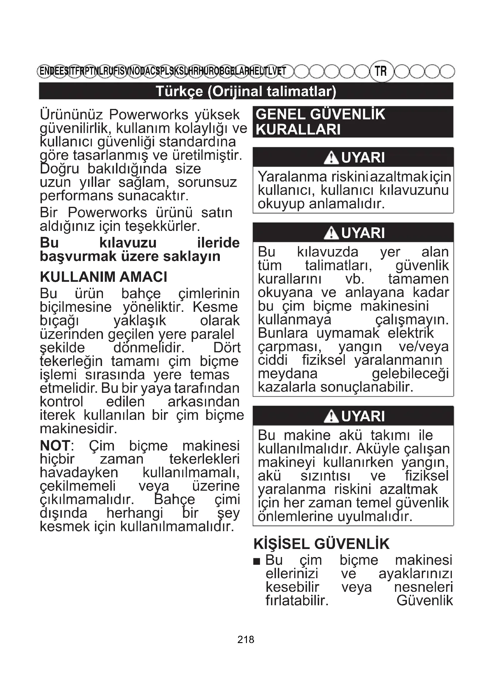 EN DE ES IT FR PT NL RU FI SV NO DA CS PL SK SL HR HU RO BG EL AR HE LT LV ET Ürününüz Powerworks yüksek güvenilirlik, kullanım kolaylığı ve kullanıcı güvenliği standardına göre tasarlanmış ve üretilmiştir. Doğru bakıldığında size uzun yıllar sağlam, sorunsuz performans sunacaktır. Bir Powerworks ürünü satın aldığınız için teşekkürler. Bu kılavuzu ileride başvurmak üzere saklayın KULLANIM AMACI Bu ürün bahçe çimlerinin biçilmesine yöneliktir. Kesme bıçağı yaklaşık olarak üzerinden geçilen yere paralel şekilde dönmelidir. Dört tekerleğin tamamı çim biçme işlemi sırasında yere temas etmelidir. Bu bir yaya tarafından kontrol edilen arkasından iterek kullanılan bir çim biçme makinesidir. NOT: Çim biçme makinesi hiçbir zaman tekerlekleri havadayken kullanılmamalı, çekilmemeli veya üzerine çıkılmamalıdır. Bahçe çimi dışında herhangi bir şey kesmek için kullanılmamalıdır.