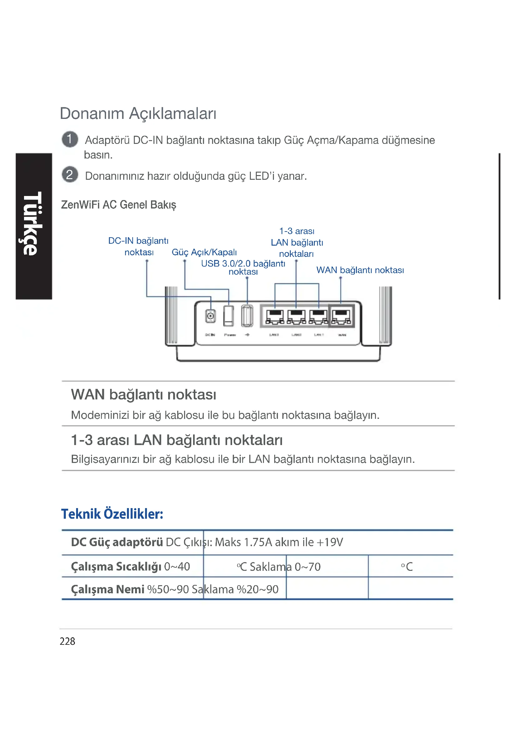 Çalışma Nemi %50~90 Saklama %20~90 Teknik Özellikler: ZenWiFi AC Genel BakışGüç Açık/KapalıDC-IN bağlantı noktasıWAN bağlantı noktası1-3 arası LAN bağlantı noktalarıUSB 3.0/2.0 bağlantı noktası229 Türkçe Kurulumdan Önce Bağımsız bir yönlendirici kurulmaya hazırlanıyor