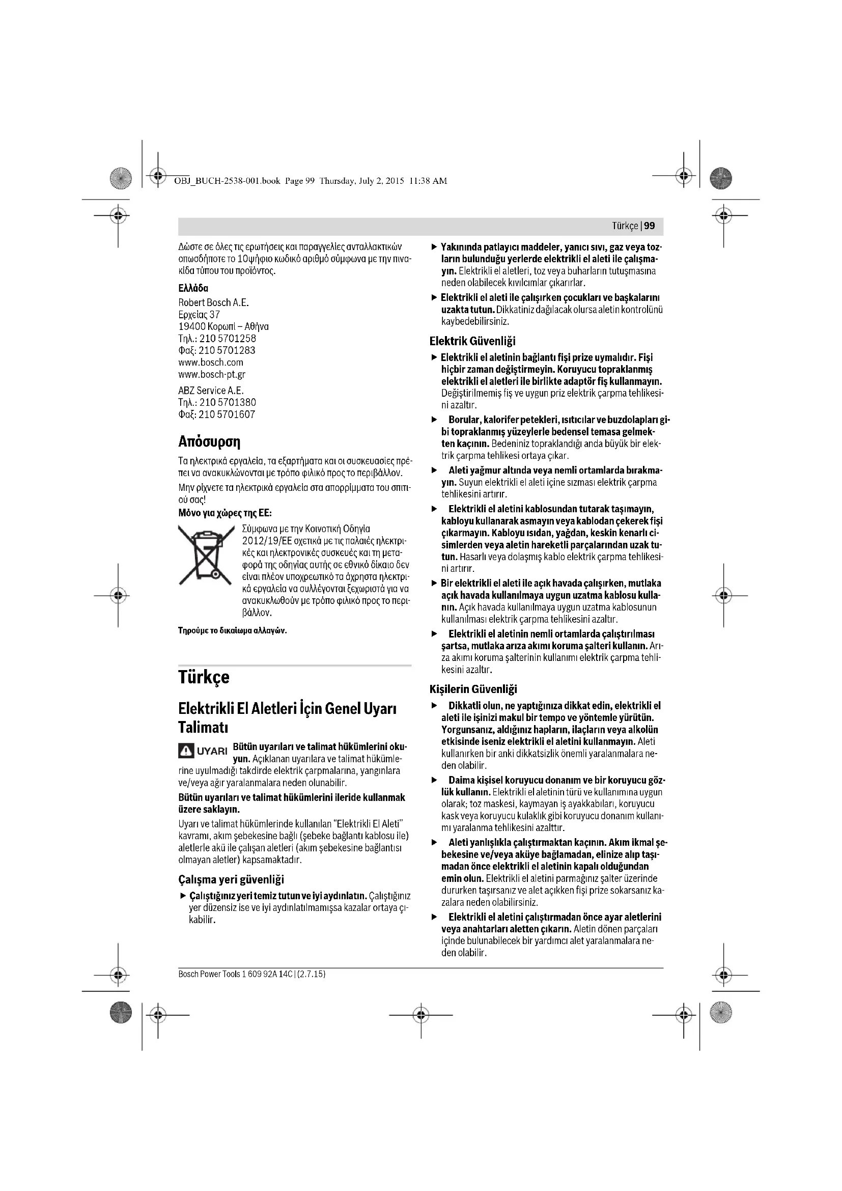 Τηρούμε το δικαίωμα αλλαγών. Türkçe Elektrikli El Aletleri İçin Genel Uyarı Talimatı Bütün uyarıları ve talimat hükümlerini oku- yun. Açıklanan uyarılara ve talimat hükümle- rine uyulmadığı takdirde elektrik çarpmalarına, yangınlara ve/veya ağır yaralanmalara neden olunabilir. Bütün uyarıları ve talimat hükümlerini ileride kullanmak üzere saklayın. Uyarı ve talimat hükümlerinde kullanılan “Elektrikli El Aleti” kavramı, akım şebekesine bağlı (şebeke bağlantı kablosu ile) aletlerle akü ile çalışan aletleri (akım şebekesine bağlantısı olmayan aletler) kapsamaktadır. Çalışma yeri güvenliği Çalıştığınız yeri temiz tutun ve iyi aydınlatın. Çalıştığınız yer düzensiz ise ve iyi aydınlatılmamışsa kazalar ortaya çı- kabilir. Yakınında patlayıcı maddeler, yanıcı sıvı, gaz veya toz- ların bulunduğu yerlerde elektrikli el aleti ile çalışma- yın. Elektrikli el aletleri, toz veya buharların tutuşmasına neden olabilecek kıvılcımlar çıkarırlar. Elektrikli el aleti ile çalışırken çocukları ve başkalarını uzakta tutun. Dikkatiniz dağılacak olursa aletin kontrolünü kaybedebilirsiniz. Elektrik Güvenliği Elektrikli el aletinin bağlantı fişi prize uymalıdır. Fişi hiçbir zaman değiştirmeyin. Koruyucu topraklanmış elektrikli el aletleri ile birlikte adaptör fiş kullanmayın. Değiştirilmemiş fiş ve uygun priz elektrik çarpma tehlikesi- ni azaltır. Borular, kalorifer petekleri, ısıtıcılar ve buzdolapları gi- bi topraklanmış yüzeylerle bedensel temasa gelmek- ten kaçının. Bedeniniz topraklandığı anda büyük bir elek- trik çarpma tehlikesi ortaya çıkar. Aleti yağmur altında veya nemli ortamlarda bırakma- yın. Suyun elektrikli el aleti içine sızması elektrik çarpma tehlikesini artırır. Elektrikli el aletini kablosundan tutarak taşımayın, kabloyu kullanarak asmayın veya kablodan çekerek fişi çıkarmayın. Kabloyu ısıdan, yağdan, keskin kenarlı ci- simlerden veya aletin hareketli parçalarından uzak tu- tun. Hasarlı veya dolaşmış kablo elektrik çarpma tehlikesi- ni artırır. Bir elektrikli el aleti ile açık havada çalışırken, mutlaka açık havada kullanılmaya uygun uzatma kablosu kulla- nın. Açık havada kullanılmaya uygun uzatma kablosunun kullanılması elektrik çarpma tehlikesini azaltır. Elektrikli el aletinin nemli ortamlarda çalıştırılması şartsa, mutlaka arıza akımı koruma şalteri kullanın. Arı- za akımı koruma şalterinin kullanımı elektrik çarpma tehli- kesini azaltır. Kişilerin Güvenliği Dikkatli olun, ne yaptığınıza dikkat edin, elektrikli el aleti ile işinizi makul bir tempo ve yöntemle yürütün. Yorgunsanız, aldığınız hapların, ilaçların veya alkolün etkisinde iseniz elektrikli el aletini kullanmayın. Aleti kullanırken bir anki dikkatsizlik önemli yaralanmalara ne- den olabilir. Daima kişisel koruyucu donanım ve bir koruyucu göz- lük kullanın. Elektrikli el aletinin türü ve kullanımına uygun olarak; toz maskesi, kaymayan iş ayakkabıları, koruyucu kask veya koruyucu kulaklık gibi koruyucu donanım kullanı- mı yaralanma tehlikesini azalttır. Aleti yanlışlıkla çalıştırmaktan kaçının. Akım ikmal şe- bekesine ve/veya aküye bağlamadan, elinize alıp taşı- madan önce elektrikli el aletinin kapalı olduğundan emin olun. Elektrikli el aletini parmağınız şalter üzerinde dururken taşırsanız ve alet açıkken fişi prize sokarsanız ka- zalara neden olabilirsiniz. Elektrikli el aletini çalıştırmadan önce ayar aletlerini veya anahtarları aletten çıkarın. Aletin dönen parçaları içinde bulunabilecek bir yardımcı alet yaralanmalara ne- den olabilir. UYARI OBJ_BUCH-2538-001.book Page 99 Thursday, July 2, 2015 11:38 AM100 | Türkçe 1 609 92A 14C | (2.7.15) Bosch Power Tools Çalışırken bedeniniz anormal durumda olmasın. Çalı- şırken duruşunuz güvenli olsun ve dengenizi her zaman koruyun. Bu sayede aleti beklenmedik durumlarda daha iyi kontrol edebilirsiniz. Uygun iş elbiseleri giyin. Geniş giysiler giymeyin ve ta- kı takmayın. Saçlarınızı, giysileriniz ve eldivenlerinizi aletin hareketli parçalarından uzak tutun. Bol giysiler, uzun saçlar veya takılar aletin hareketli parçaları tarafından tutulabilir. Toz emme donanımı veya toz tutma tertibatı kullanır- ken, bunların bağlı olduğundan ve doğru kullanıldığın- dan emin olun. Toz emme donanımının kullanımı tozdan kaynalanabilecek tehlikeleri azaltır. Elektrikli el aletlerinin özenle kullanımı ve bakımı Aleti aşırı ölçede zorlamayın. Yaptığınız işe uygun elek- trikli el aletleri kullanın. Uygun performanslı elektrikli el aleti ile, belirlenen çalışma alanında daha iyi ve güvenli ça- lışırsınız. Şalteri bozuk olan elektrikli el aletini kullanmayın. Açı- lıp kapanamayan bir elektrikli el aleti tehlikelidir ve onarıl- malıdır. Alette bir ayarlama işlemine başlamadan ve/veya akü- yü çıkarmadan önce, herhangi bir aksesuarı değiştirir- ken veya aleti elinizden bırakırken fişi prizden çekin. Bu önlem, elektrikli el aletinin yanlışlıkla çalışmasını önler. Kullanım dışı duran elektrikli el aletlerini çocukların ulaşamayacağı bir yerde saklayın. Aleti kullanmayı bil- meyen veya bu kullanım kılavuzunu okumayan kişilerin aletle çalışmasına izin vermeyin. Deneyimsiz kişiler tara- fından kullanıldığında elektrikli el aletleri tehlikelidir. Elektrikli el aletinizin bakımını özenle yapın. Elektrikli el aletinizin kusursuz olarak işlev görmesini engelleye- bilecek bir durumun olup olmadığını, hareketli parça- ların kusursuz olarak işlev görüp görmediklerini ve sıkı- şıp sıkışmadıklarını, parçaların hasarlı olup olmadığını kontrol edin. Aleti kullanmaya başlamadan önce hasar- lı parçaları onartın. Birçok iş 