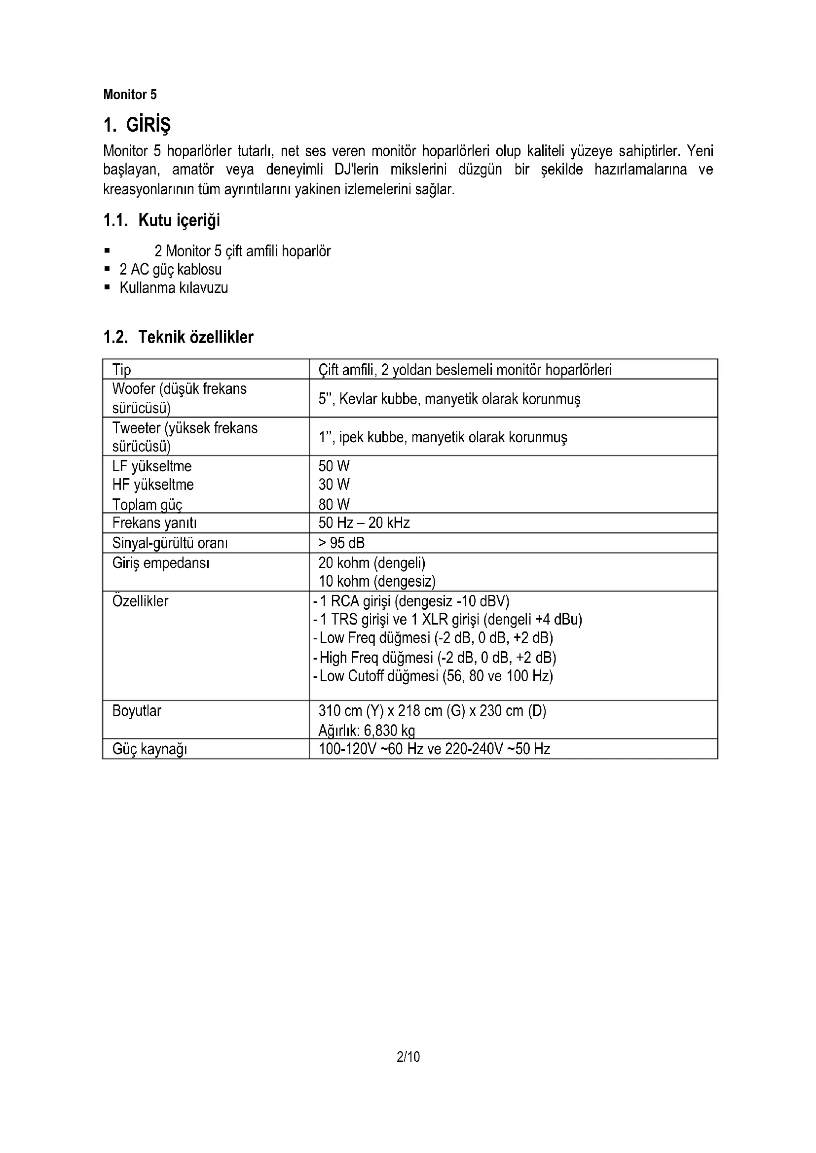 Monitor 5 hoparlörler tutarlı, net ses veren monitör hoparlörleri olup kaliteli yüzeye sahiptirler. Yeni başlayan, amatör veya deneyimli DJ'lerin mikslerini düzgün bir şekilde hazırlamalarına ve kreasyonlarının tüm ayrıntılarını yakinen izlemelerini sağlar. 1.1. Kutu içeriği 2 Monitor 5 çift amfili hoparlör 2 AC güç kablosu Kullanma kılavuzu 1.2. Teknik özellikler Tip Çift amfili, 2 yoldan beslemeli monitör hoparlörleri Woofer (düşük frekans sürücüsü) 5’’, Kevlar kubbe, manyetik olarak korunmuş Tweeter (yüksek frekans sürücüsü) 1’’, ipek kubbe, manyetik olarak korunmuş LF yükseltme HF yükseltme Toplam güç 50 W 30 W 80 W Frekans yanıtı 50 Hz – 20 kHz Sinyal-gürültü oranı > 95 dB Giriş empedansı 20 kohm (dengeli) 10 kohm (dengesiz) Özellikler - 1 RCA girişi (dengesiz -10 dBV) - 1 TRS girişi ve 1 XLR girişi (dengeli +4 dBu) - Low Freq düğmesi (-2 dB, 0 dB, +2 dB) - High Freq düğmesi (-2 dB, 0 dB, +2 dB) - Low Cutoff düğmesi (56, 80 ve 100 Hz) Boyutlar 310 cm (Y) x 218 cm (G) x 230 cm (D) Ağırlık: 6,830 kg Güç kaynağı 100-120V ~60 Hz ve 220-240V ~50 HzMonitor 5 3/10
