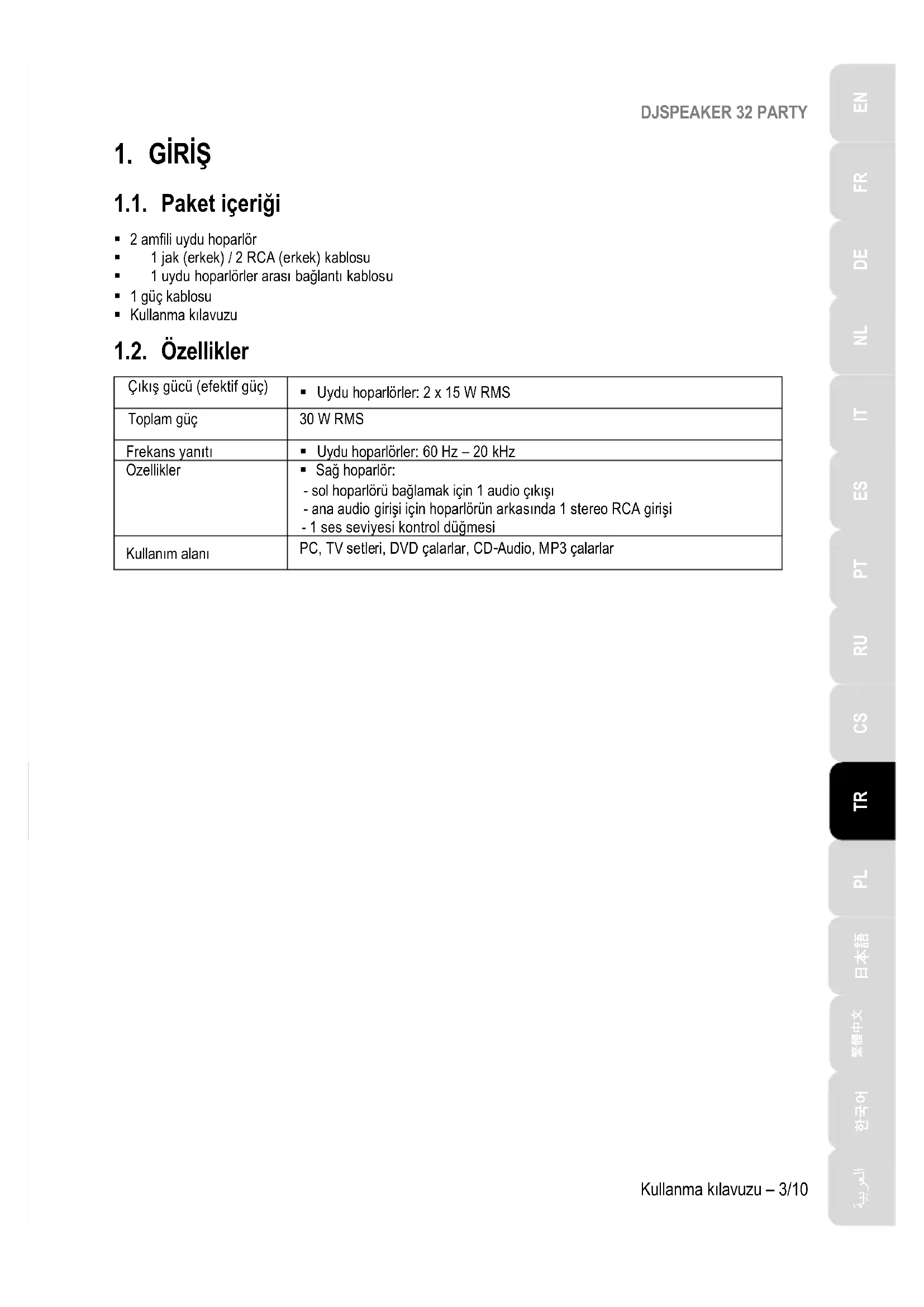 1.1. Paket içeriği 2 amfili uydu hoparlör 1 jak (erkek) / 2 RCA (erkek) kablosu 1 uydu hoparlörler arası bağlantı kablosu 1 güç kablosu Kullanma kılavuzu 1.2. Özellikler Çıkış gücü (efektif güç) Uydu hoparlörler: 2 x 15 W RMS Toplam güç 30 W RMS Frekans yanıtı Uydu hoparlörler: 60 Hz – 20 kHz Özellikler Sağ hoparlör: - sol hoparlörü bağlamak için 1 audio çıkışı - ana audio girişi için hoparlörün arkasında 1 stereo RCA girişi - 1 ses seviyesi kontrol düğmesi Kullanım alanı PC, TV setleri, DVD çalarlar, CD-Audio, MP3 çalarlarDJSPEAKER 32 PARTY 4/10 – Kullanma Kılavuzu 1.3. Tavsiyeler - Düşmelerini engellemek için uydu hoparlörlerinizi düz bir zemine yerleştirin. - İçindeki bileşenlere hasar verme ihtimali olduğundan hoparlör setinizin içini asla açmayın. - Bu hoparlör seti, ılıman bir ortamda kullanılmak üzere tasarlanmıştır. - Yangın veya elektrik çarpması tehlikesini önlemek için hoparlör setinizi şunlardan uzak tutun: - Yağmur veya nem ve tüm sıvılar (su, kimyasal ürünler veya diğer sıvılar), - Isıtıcı gibi ısı kaynakları, sobalar veya diğer ısı üreten aygıtlar (amfiler dahil), - Doğrudan güneş ışığı. - Hoparlör setinizi su damlalarına veya sıçramalarına maruz bırakmayın. - Hoparlör setinizin üzerine asla sıvı dolu eşyalar (bardak, vazo...) koymayın. - Hoparlör kitinizi uzun süre kullanmamayı planlıyorsanız güç kablosunun fişini prizden çekin. Güç kablosunun fişini prizden çekmek için fişi tutarak çekin; asla kablodan tutarak çekmeyin. - Hoparlör setinin, elektrik prizine bağlı fişinin kolayca erişilebilir olduğundan emin olun. - Temizlik öncesinde hoparlör setinin bağlantısını kesin. Nemli bir bez kullanın ve aerosol temizlik maddeleri kullanmaktan kaçının. - Hoparlör setinin elektrik fişi, cihazı tamamen kapatmak için kullanılır ve bu nedenle daima kolayca erişilir olmalıdır. - Etiketler hoparlörlerin arka kısmına yer almaktadır.