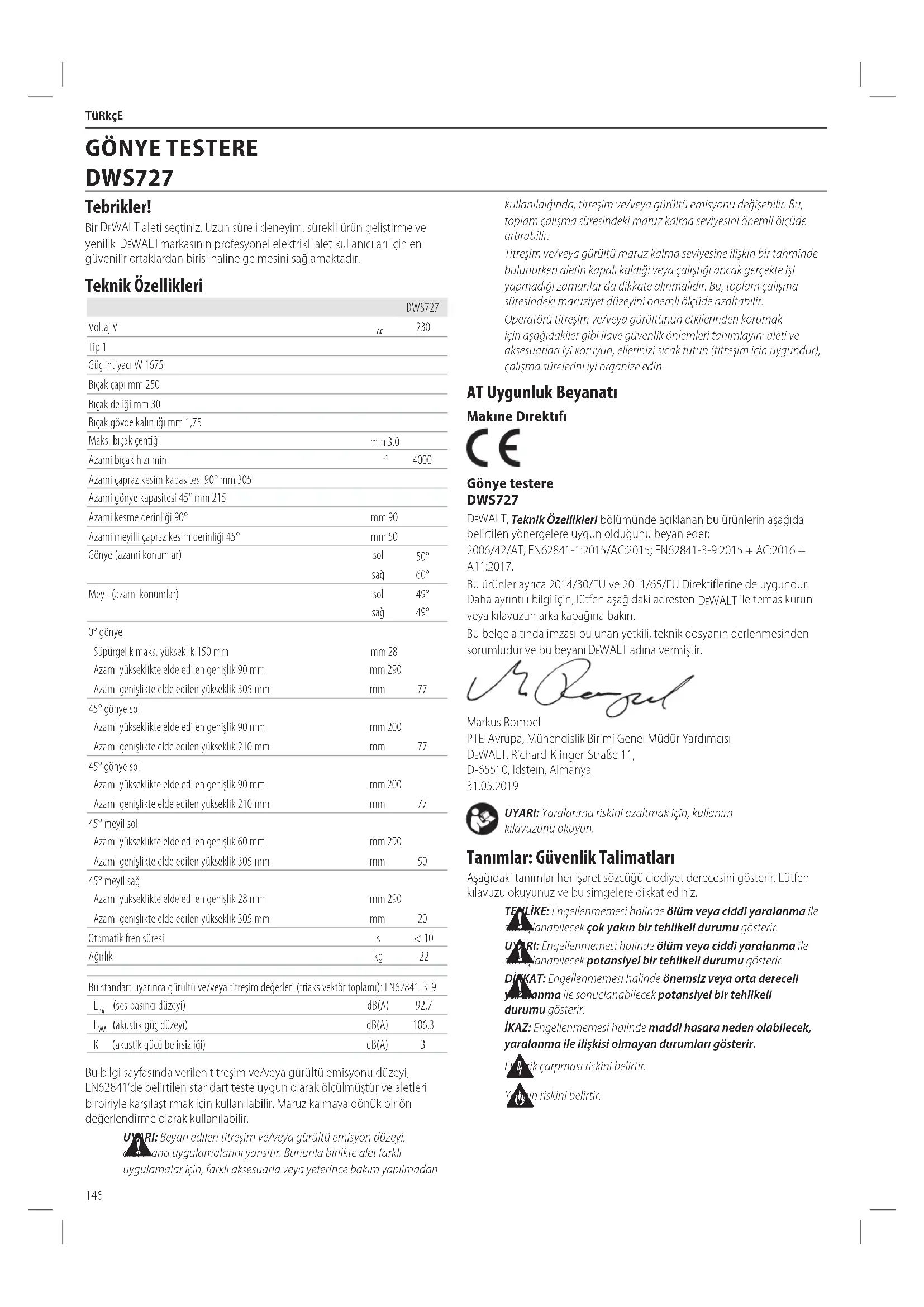Yangın riskinibelirtir. AT Uygunluk Beyanatı Makıne Dırektıfı Gönye testere DWS727 DeWALT , Teknik Özellikleri bölümünde açıklanan bu ürünlerin aşağıda belirtilen yönergelere uygun olduğunu beyan eder: 2006/42/AT, EN62841-1:2015/AC:2015; EN62841-3-9:2015 + AC:2016 + A11:2017. Bu ürünler ayrıca 2014/30/EU ve 2011/65/EU Direktiflerine de uygundur. Daha ayrıntılı bilgi için, lütfen aşağıdaki adresten DeWALT ile temas kurun veya kılavuzun arka kapağınabakın. Bu belge altında imzası bulunan yetkili, teknik dosyanın derlenmesinden sorumludur ve bu beyanı DeWALT adınavermiştir. Markus Rompel PTE-Avrupa, Mühendislik Birimi Genel Müdür Yardımcısı DeWALT , Richard-Klinger-Straße 11, D-65510, Idstein, Almanya