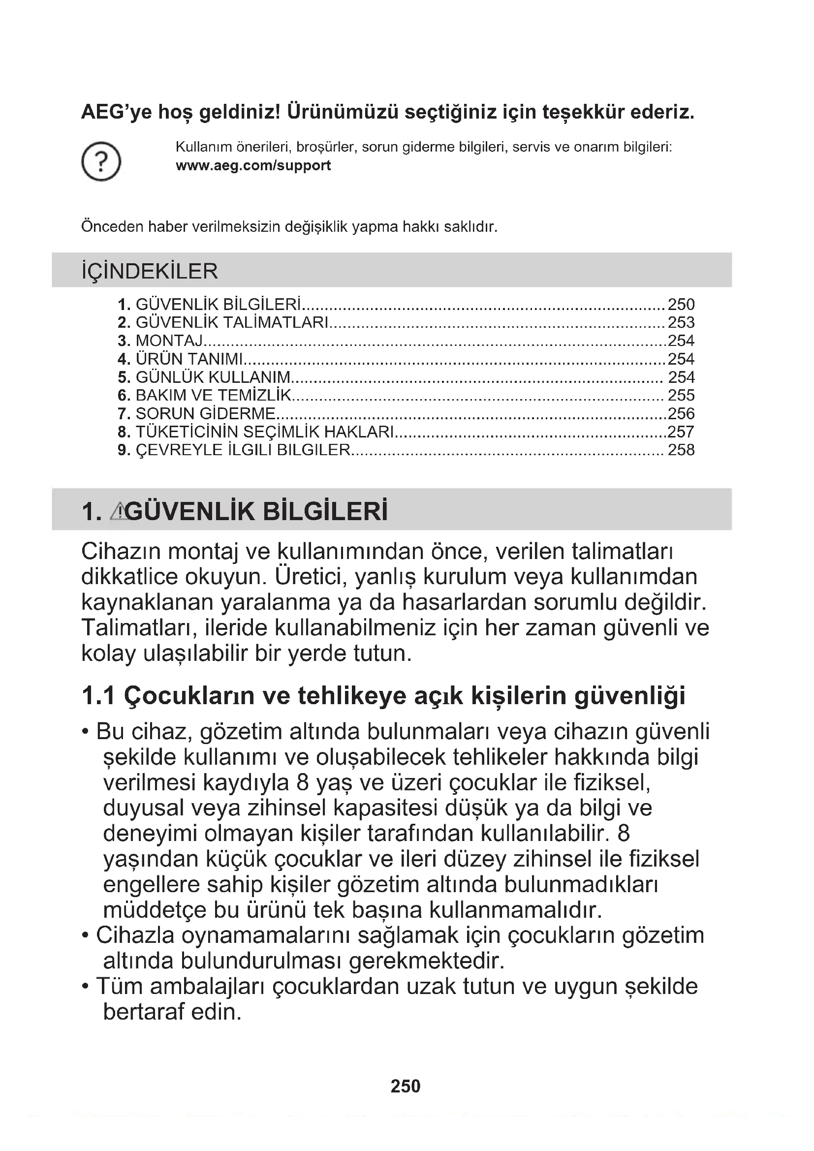 - Tüm ambalajları çocuklardan uzak tutun ve uygun şekilde bertaraf edin. 250• Cihaz çalışırken çocukları ve hayvanları cihazdan uzak tutun.