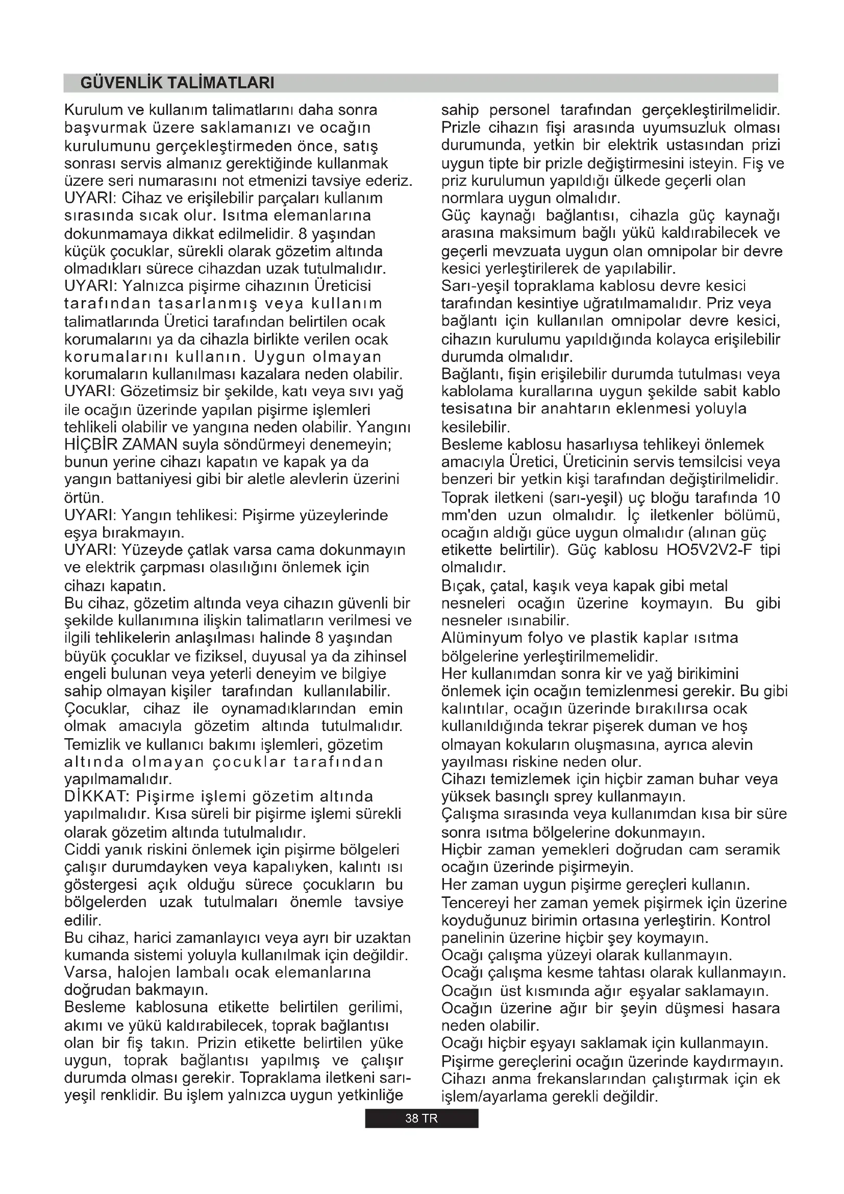 sahip personel tarafından gerçekleştirilmelidir. Prizle cihazın fişi arasında uyumsuzluk olması durumunda, yetkin bir elektrik ustasından prizi uygun tipte bir prizle değiştirmesini isteyin. Fiş ve priz kurulumun yapıldığı ülkede geçerli olan normlara uygun olmalıdır. Güç kaynağı bağlantısı, cihazla güç kaynağı arasına maksimum bağlı yükü kaldırabilecek ve geçerli mevzuata uygun olan omnipolar bir devre kesici yerleştirilerek de yapılabilir. Sarı-yeşil topraklama kablosu devre kesici tarafından kesintiye uğratılmamalıdır. Priz veya bağlantı için kullanılan omnipolar devre kesici, cihazın kurulumu yapıldığında kolayca erişilebilir durumda olmalıdır. Bağlantı, fişin erişilebilir durumda tutulması veya kablolama kurallarına uygun şekilde sabit kablo tesisatına bir anahtarın eklenmesi yoluyla kesilebilir. Besleme kablosu hasarlıysa tehlikeyi önlemek amacıyla Üretici, Üreticinin servis temsilcisi veya benzeri bir yetkin kişi tarafından değiştirilmelidir. Toprak iletkeni (sarı-yeşil) uç bloğu tarafında 10 mm'den uzun olmalıdır. İç iletkenler bölümü, ocağın aldığı güce uygun olmalıdır (alınan güç etikette belirtilir). Güç kablosu HO5V2V2-F tipi olmalıdır. Bıçak, çatal, kaşık veya kapak gibi metal nesneleri ocağın üzerine koymayın. Bu gibi nesneler ısınabilir. Alüminyum folyo ve plastik kaplar ısıtma bölgelerine yerleştirilmemelidir. Her kullanımdan sonra kir ve yağ birikimini önlemek için ocağın temizlenmesi gerekir. Bu gibi kalıntılar, ocağın üzerinde bırakılırsa ocak kullanıldığında tekrar pişerek duman ve hoş olmayan kokuların oluşmasına, ayrıca alevin yayılması riskine neden olur. Cihazı temizlemek için hiçbir zaman buhar veya yüksek basınçlı sprey kullanmayın. Çalışma sırasında veya kullanımdan kısa bir süre sonra ısıtma bölgelerine dokunmayın. Hiçbir zaman yemekleri doğrudan cam seramik ocağın üzerinde pişirmeyin. Her zaman uygun pişirme gereçleri kullanın. Tencereyi her zaman yemek pişirmek için üzerine koyduğunuz birimin ortasına yerleştirin. Kontrol panelinin üzerine hiçbir şey koymayın. Ocağı çalışma yüzeyi olarak kullanmayın. Ocağı çalışma kesme tahtası olarak kullanmayın. Ocağın üst kısmında ağır eşyalar saklamayın. Ocağın üzerine ağır bir şeyin düşmesi hasara neden olabilir. Ocağı hiçbir eşyayı saklamak için kullanmayın. Pişirme gereçlerini ocağın üzerinde kaydırmayın. Cihazı anma frekanslarından çalıştırmak için ek işlem/ayarlama gerekli değildir. 38 TROcakla arka duvar arasında en az 55 mm, yan taraflarda da ocakla dikey mobilya veya duvarlar arasında en az 150 mm mesafe bırakın. Ocağın üzerine bir mobilya monte edilecekse gereken minimum mesafe 700 mm'dir. Ocağın üzerine davlumbaz monte ederken, lütfen davlumbaz için belirtilen kurulum gereksinimlerine başvurun; ancak her durumda ocakla davlumbaz arasındaki mesafe en az 700 mm olmalıdır.
