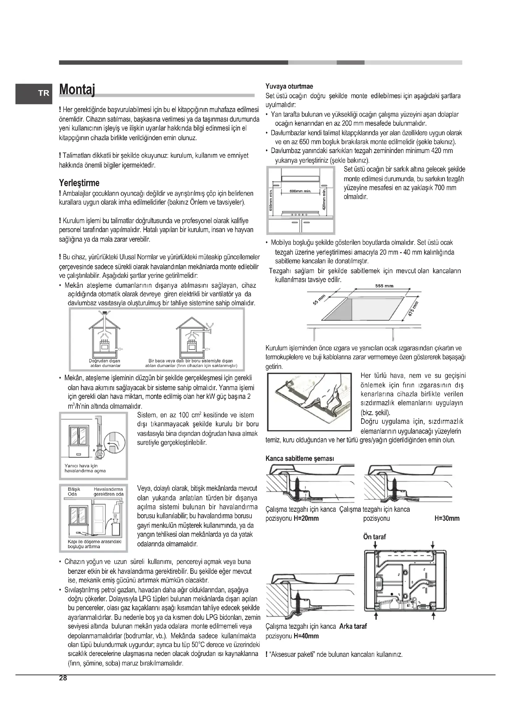 Yanıcı hava için havalandırma açmaKapı ile döşeme arasındaki boşluğu arttırmaBitişik Oda Havalandırma gerektiren oda Yuvaya oturtmae Set üstü ocağın doğru şekilde monte edilebilmesi için aşağıdaki şartlara uyulmalıdır: